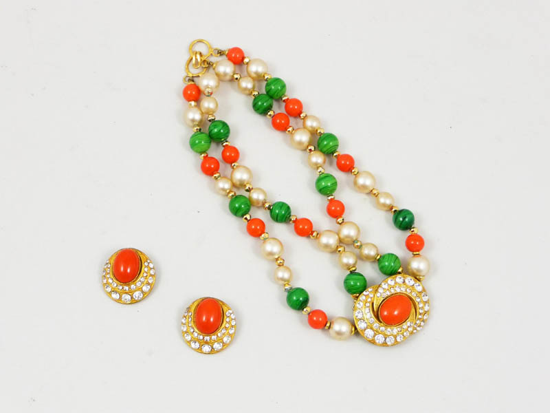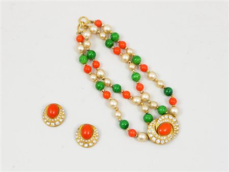 COLLANA BIJOUX E ORECCHINI IN PANDANT - BIJOUX NECKLACE WITH EARRINGS Cascio in metallo dorato, strass, perle e cabochon in vetro (2)