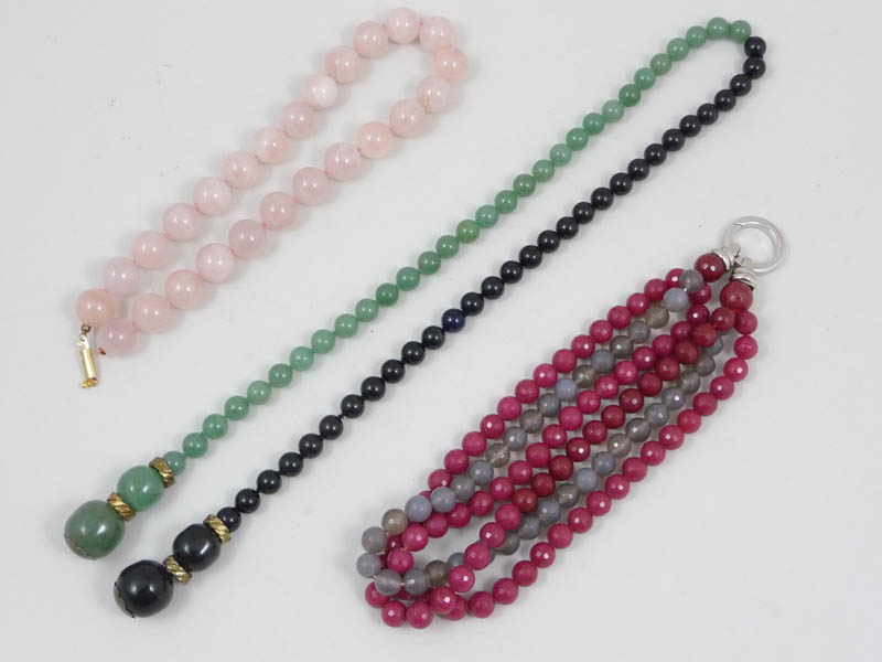 TRE COLLANE BIJOUX - THREE BIJOUX NECKLACES in pietre dure di varie grandezze, tra cui una in agata rosa, difetti (3)