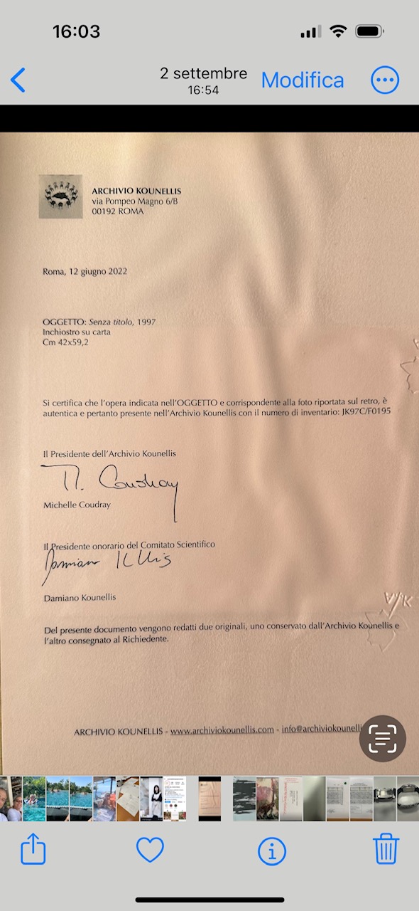 Jannis Kounellis (Il Pireo, Grecia, 1936 - Villa Mafalda, Roma, 2017). Senza titolo. 1997. Cm. 42x59.2. Inchiostro su carta. Allegata autentica dell'Archivio Kounellis, Roma.
