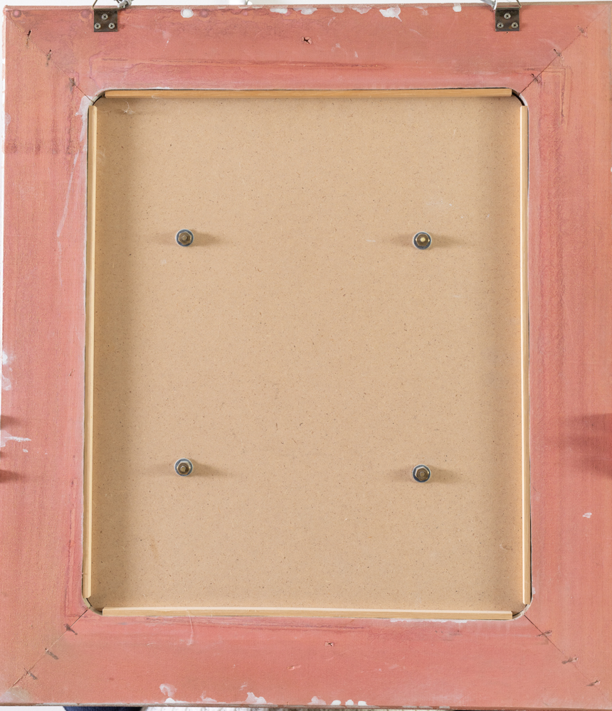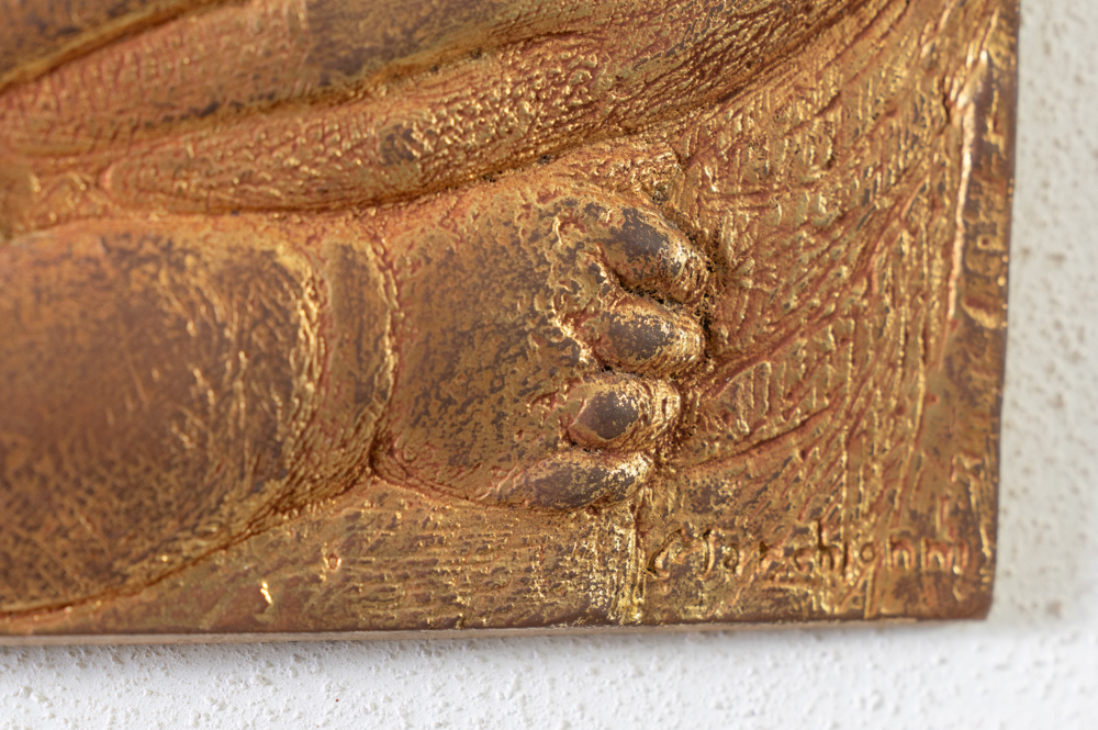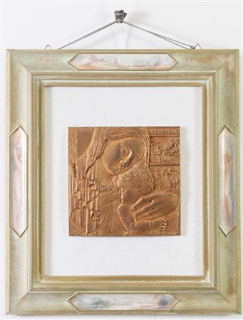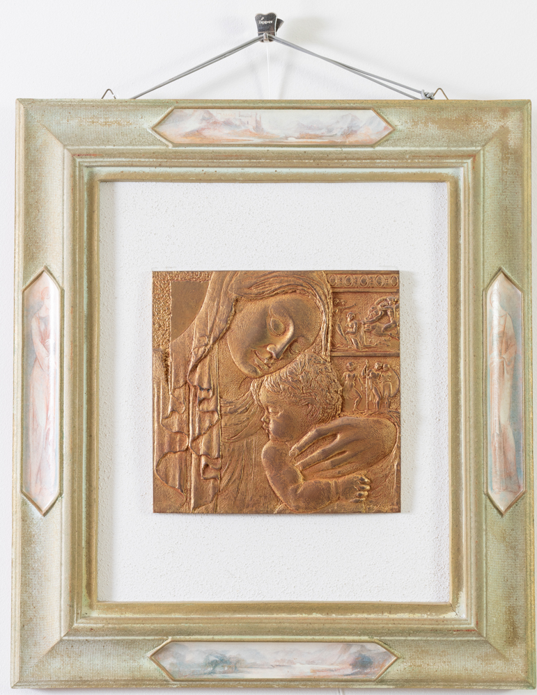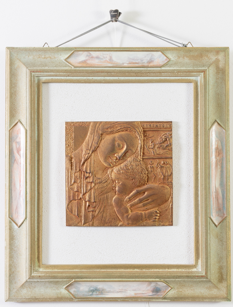 Elvio Marchionni (Spello, 1944). La Madonna della tenerezza, 2001. Cm. 25x25. Fondo in legno cm. 43,5x36,5 trattato con coloria la quarzo e cornice originale realizzata a amano e decorata a decoupage e pennello su progetto dell'Autore.. Bassorileivo in bronzo bicromato e patinato, eseguita secondo il procedimento di fusione della Monnaie de Paris. Tiratura limitata. Esemplare n. 155/500.