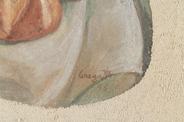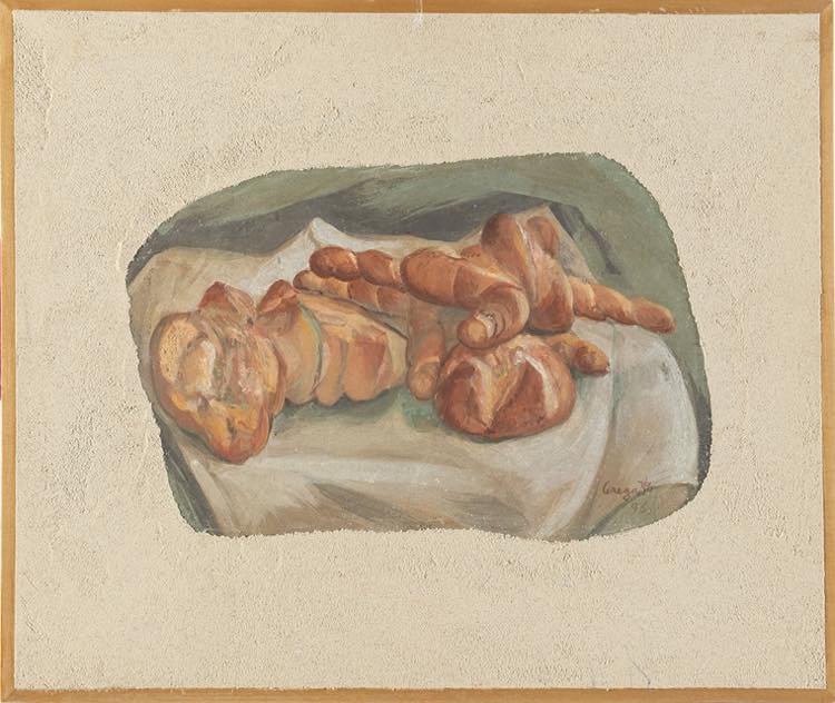 Lorenzo Ceregato (Lonigo 1933 – Bologna 2020). Natura morta con pane. Tecnica mista su tavoletta.