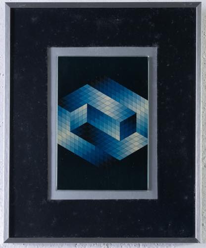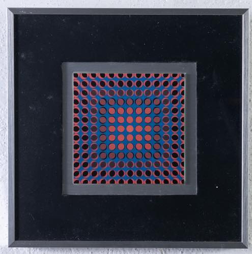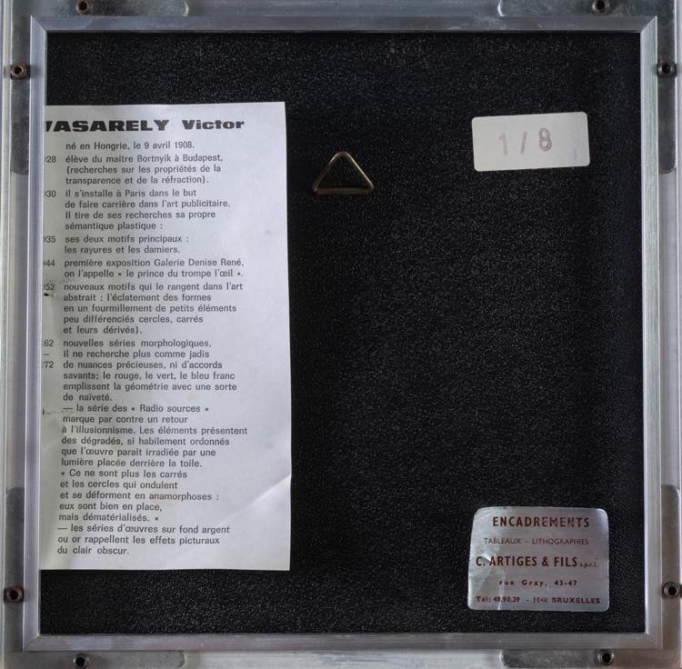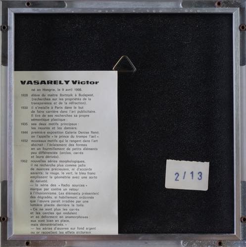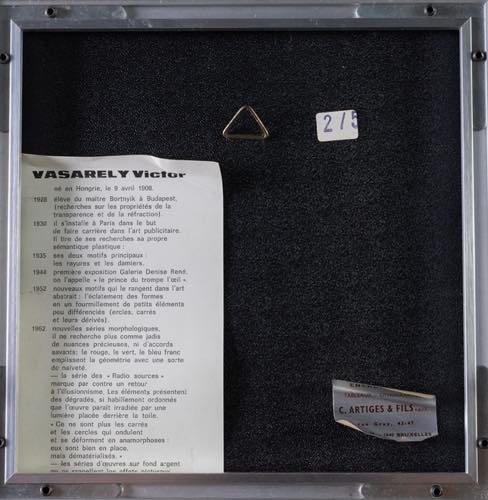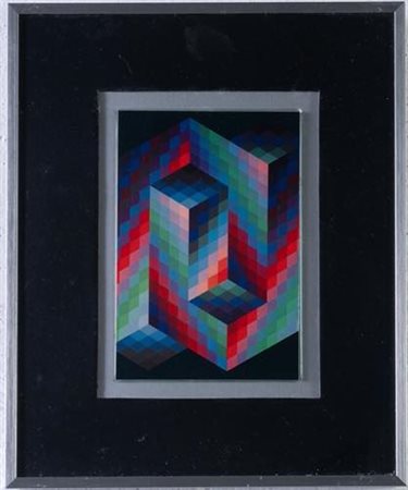 Victor Vasarely ( Pécs 1906 - Parigi 1997). Lotto di 5 stampe offset su supporto metallico. Cm. da 10x10 a 14,5x9,5. In cornice cm. da 22x22 a 26x21,5. Al verso recano etichetta Encadrements, Artiges & Fils, Bruxelles. Con cornice e vetro.