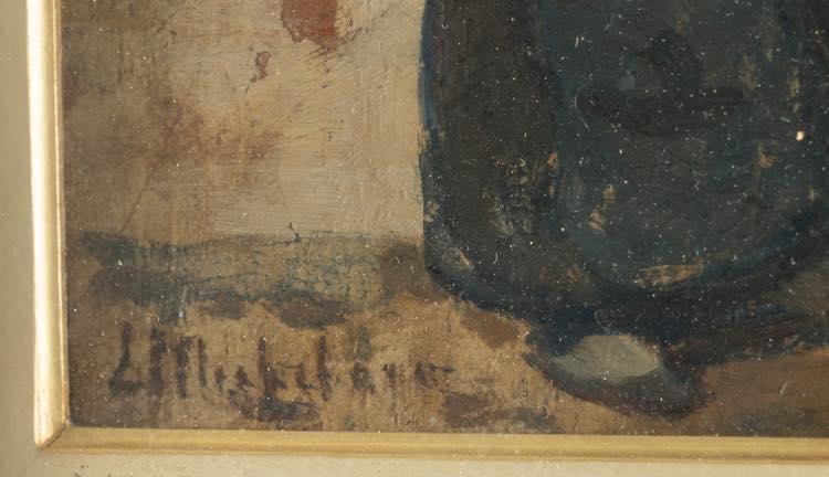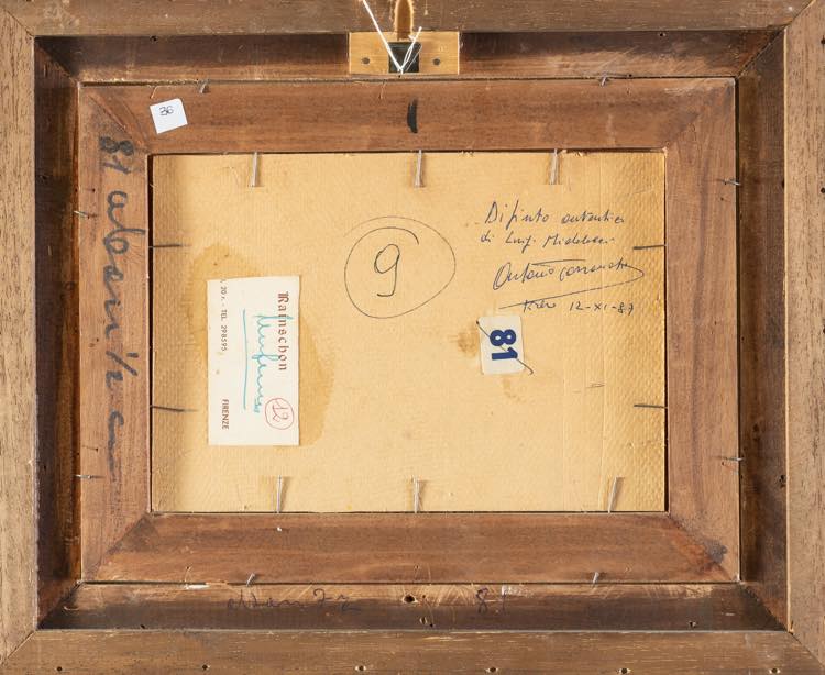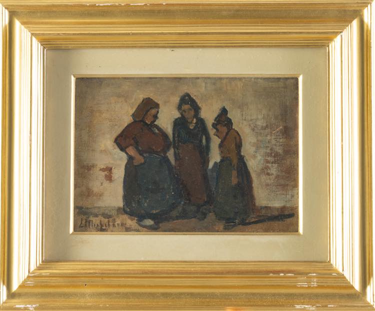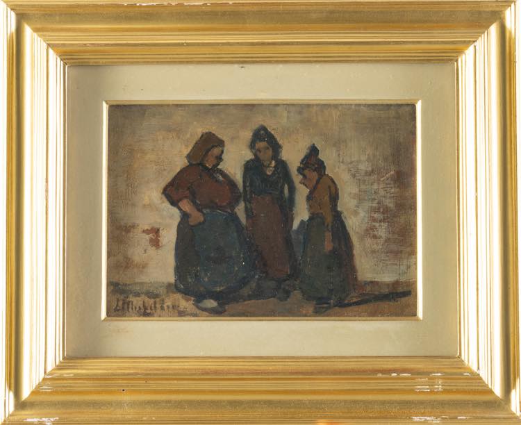 Luigi Michelacci (Meldola 1879 - Firenze 1959). Popolane. Cm. 16,5x23,5. Olio su compensato. Firmato in basso a sinistra L Michelacci. Al verso autentica a firma Antonio Parronchi, Firenze, 1987. Al verso etichetta Rainschon, Firenze. Entro cornice.