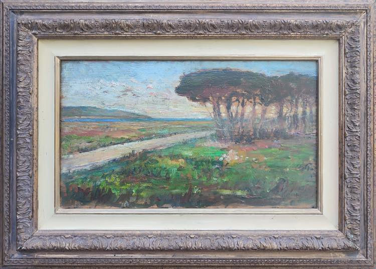 Giovanni Bartolena (Livorno, 1866 - 1942). Paesaggio con pineta. Cm. 26,5x45,5. Olio su tavoletta. Firmato Gio Bartolena in basso a destra. Con cornice.
