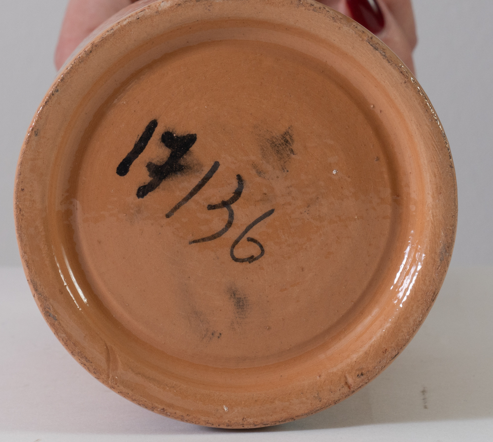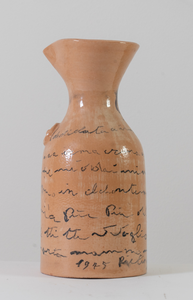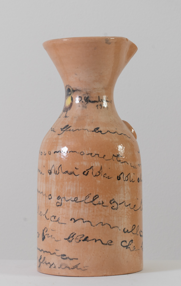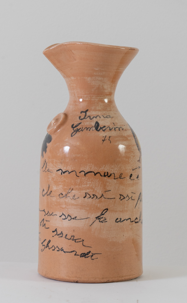 Pietro Ghizzardi (Viadana 1906 - Boretto 1986). Brocca, 1975. Cm. 22x10. Terracotta smaltata. Esemplare 17/36. Sul corpo del vaso animali dipinti e scritte. Firmata e datata Pietro Ghizzardi 1975.