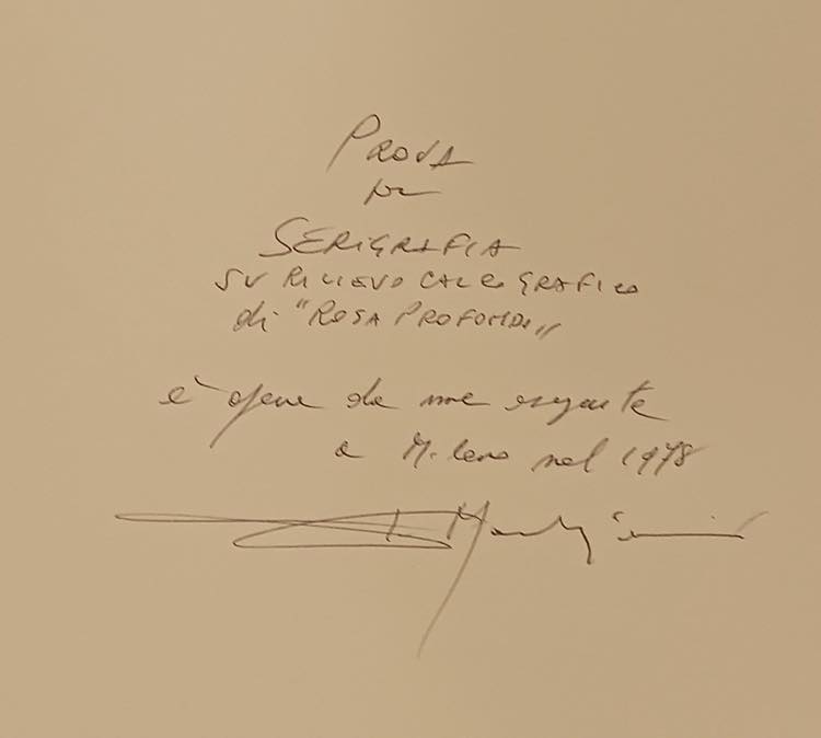 Elio Marchegiani (Siracusa 1929). Rosa profondo, 1978. Cm. 47x64. In cornice cm. 52x70. Serigrafia su rilievo calcografico. P:A. Firmata e datata in basso a destra Elio Marchegiani 78. Titolata in basso a sinistra Rosa Profondo. Al verso autentica firmata dall'artista.