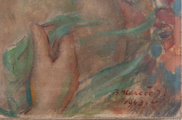 Bouhumil Marecek (Praga 1884 - 1962). Ritratto, 1943. Cm. 50,7x40,2. Olio su tela. Firmato e datato in basso a destra B. Marecek 1943.