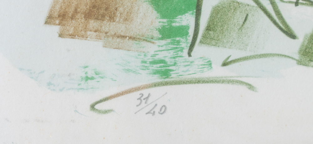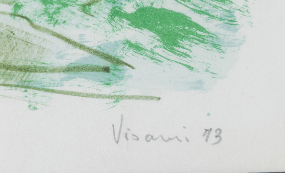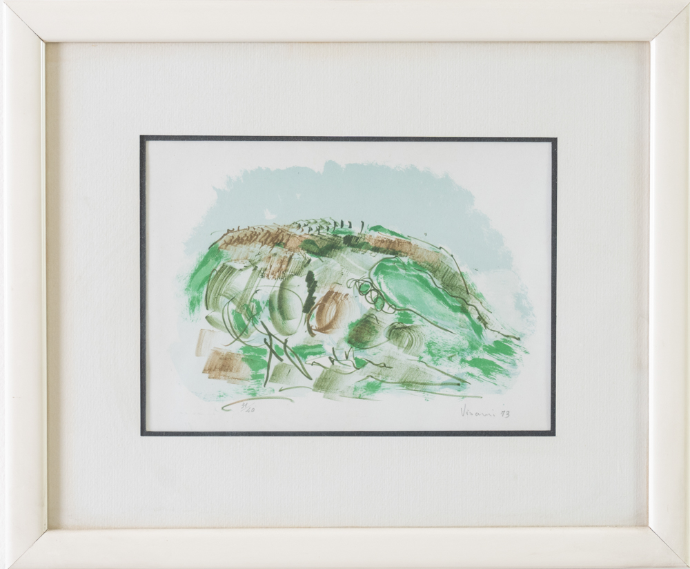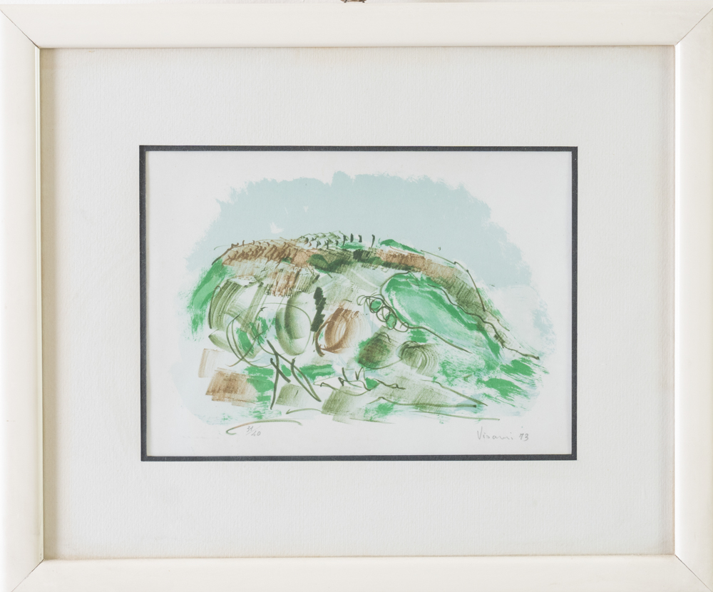 Enrico Visani (Marradi, 1938). Paesaggio. Cm. 17x23,5.Con cornice cm.32x38,5. Litografia a colori. Esemplare n.31/40. Firmata e datata in basso a destra Visani '73.