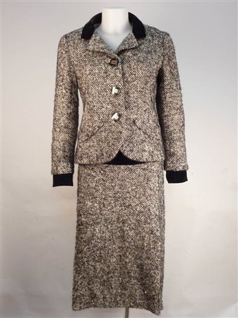 TAILLEUR SARTORIALE IN LANA SALE E PEPE - WOOL TAILLEUR Mila Schon (3), Gori Firenze, Anni Settanta composto da giacchina avvitata con dettagli in velluto nero e bottoni con logo cc, gonna con piccole pieghe laterali e baschina in velluto, abbinato a maglia sottogiacca beige a costine tg 42-44