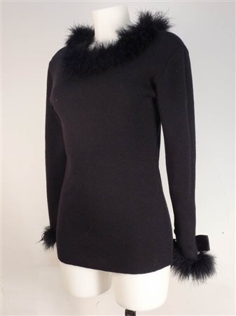 MAGLIA DA SERA IN MAGLIA RASATA NERA - BLACK EVENING SWEATHER scollo rotondo e polsini con applicazioni in piume di struzzo e fiocchi tg 46