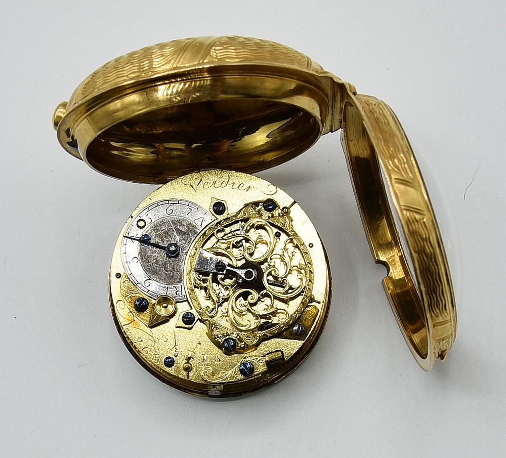 OROLOGIO DA TASCA VERDIER IN ORO 18K, CON CHIAVE, PARIS,1820-1850 CASSA: testata oro 18K lavorata a sbalzo e incisione