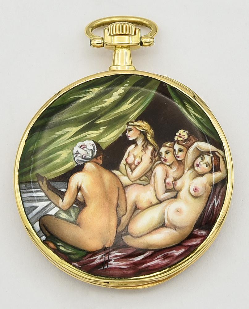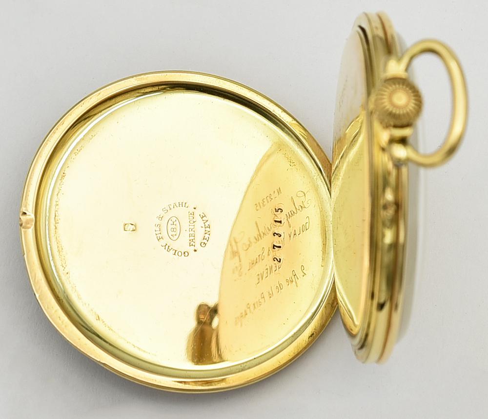 CASSA: in oro 18K, con decorazione a smalti sul retro; titolo e punzone dell'oro (testa coronata), produttore e referenza presenti sulla superficie interna del fondello piu' esterno; sulla superficie esterna del fondello piu' interno inciso: "N 27315/Golay-Leresche & fils/Golay Fils & Sthal, Srs/2 de la paix Paris"; referenza e titolo dell'oro presenti anche sulla superficie interna del fondello piu' interno; referenza e produttore leggibili sul meccanismo interno.