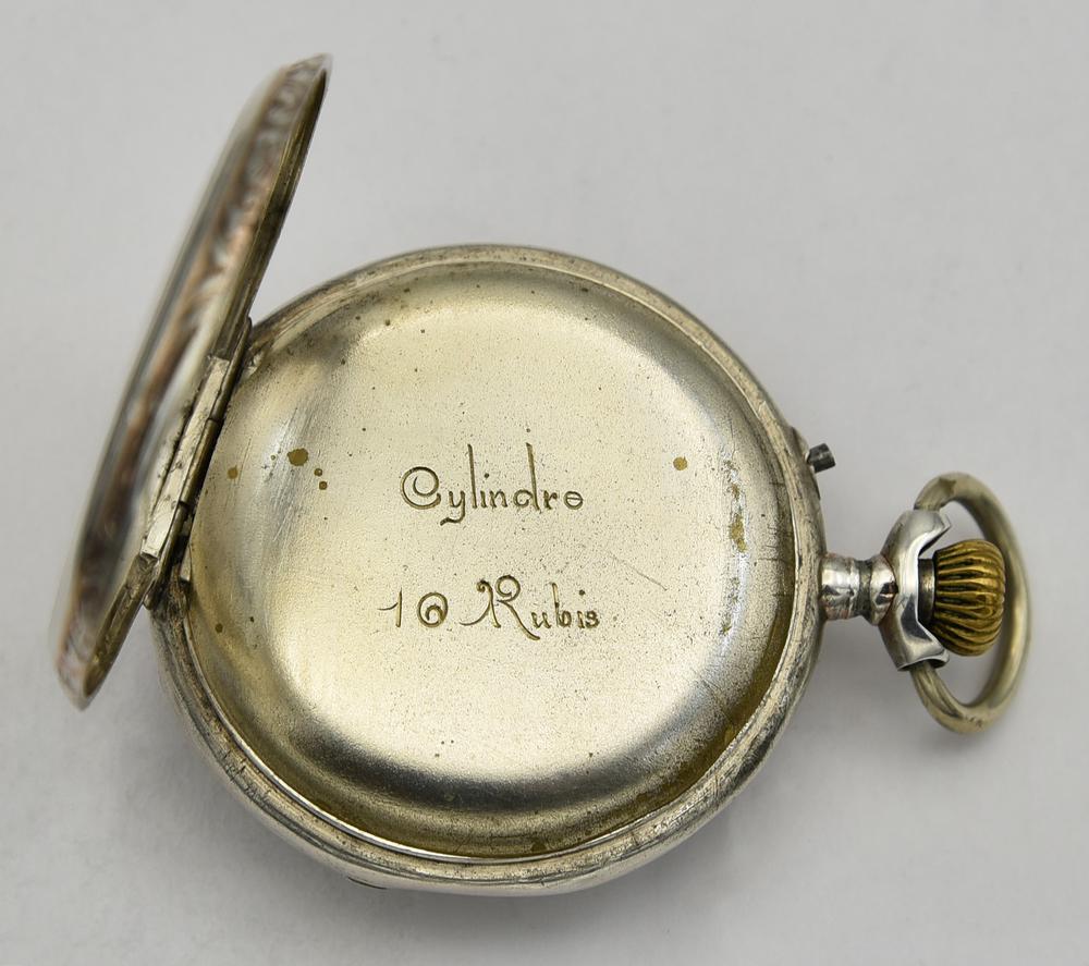 CASSA: in argento lavorata a sbalzo e incisione; monogramma del produttore, referenza, titolo e punzone (gallo) dell'argento visibili sulla superficie interna del fondello piu' esterno; fondello interno in metallo con inciso: "Cylindre/10 Rubis"