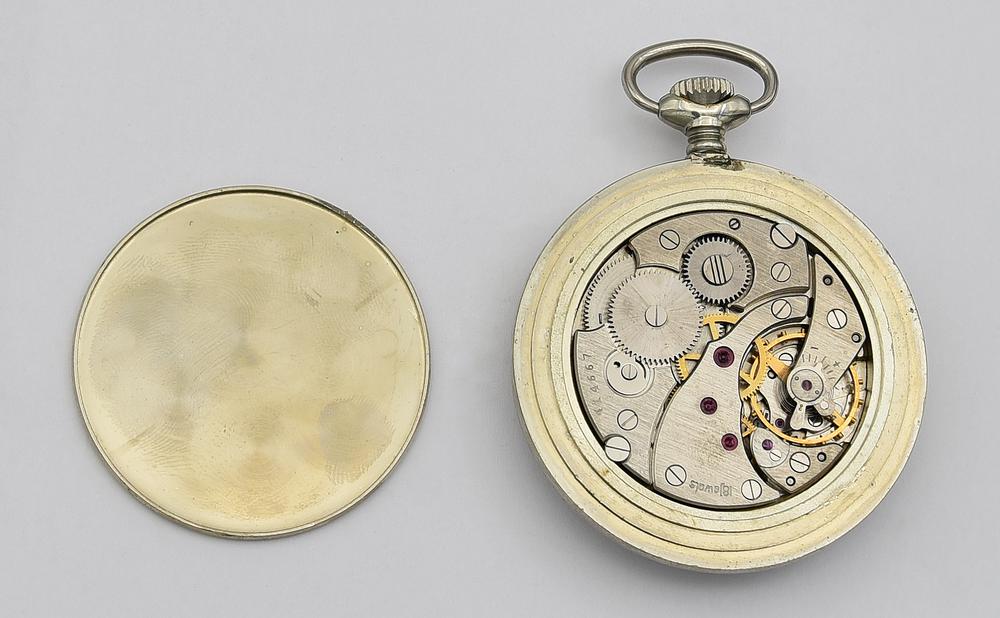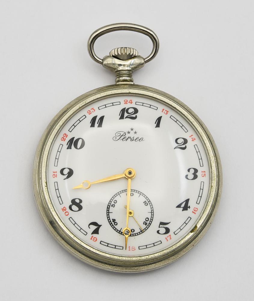 Orologio da tasca Perseo, meta' 900, acciaio CASSA: in acciaio con locomotiva...