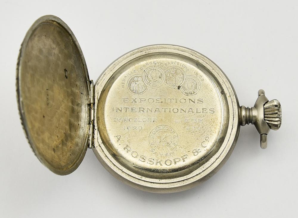 CASSA: in acciaio con doppio fondello, lavorata a sbalzo e incisione; referenza visibile sulla superficie interna del fondello piu' esterno; sulla superficie esterna del fondello piu' interno inciso: "MEDAILLE D'ARGENT BARCELONA 1929/EXPOSITION INTERNATIONALES/BARCELONE/1929/ROSSKPF & Co/PATENT/ROSSKPF & Co