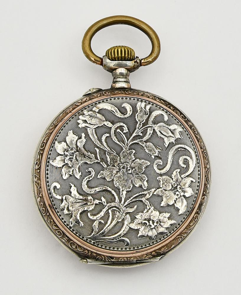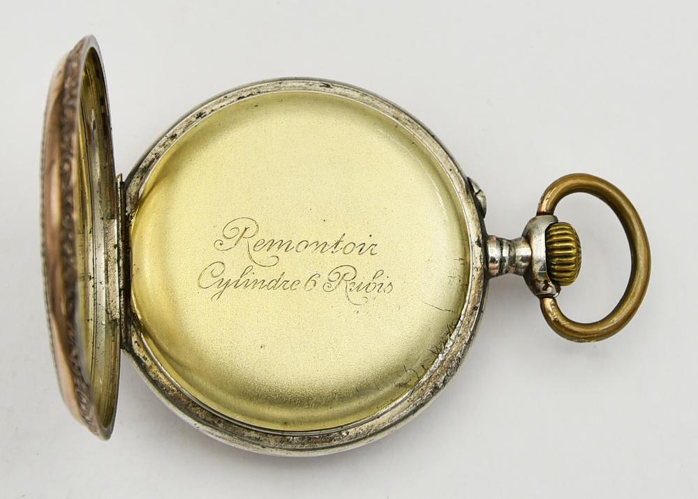 CASSA: in argento magistralmente lavorata a sbalzo e incisione; referenza visibile sulla superficie interna di entrambi i fondelli; titolo e punzone (gallo) dell'argento presenti sulla superficie interna del fondello piu' esterno; sulla superificie esterna del fondello piu' interno inciso: "Remontoir/Cylindre 6 Rubis"