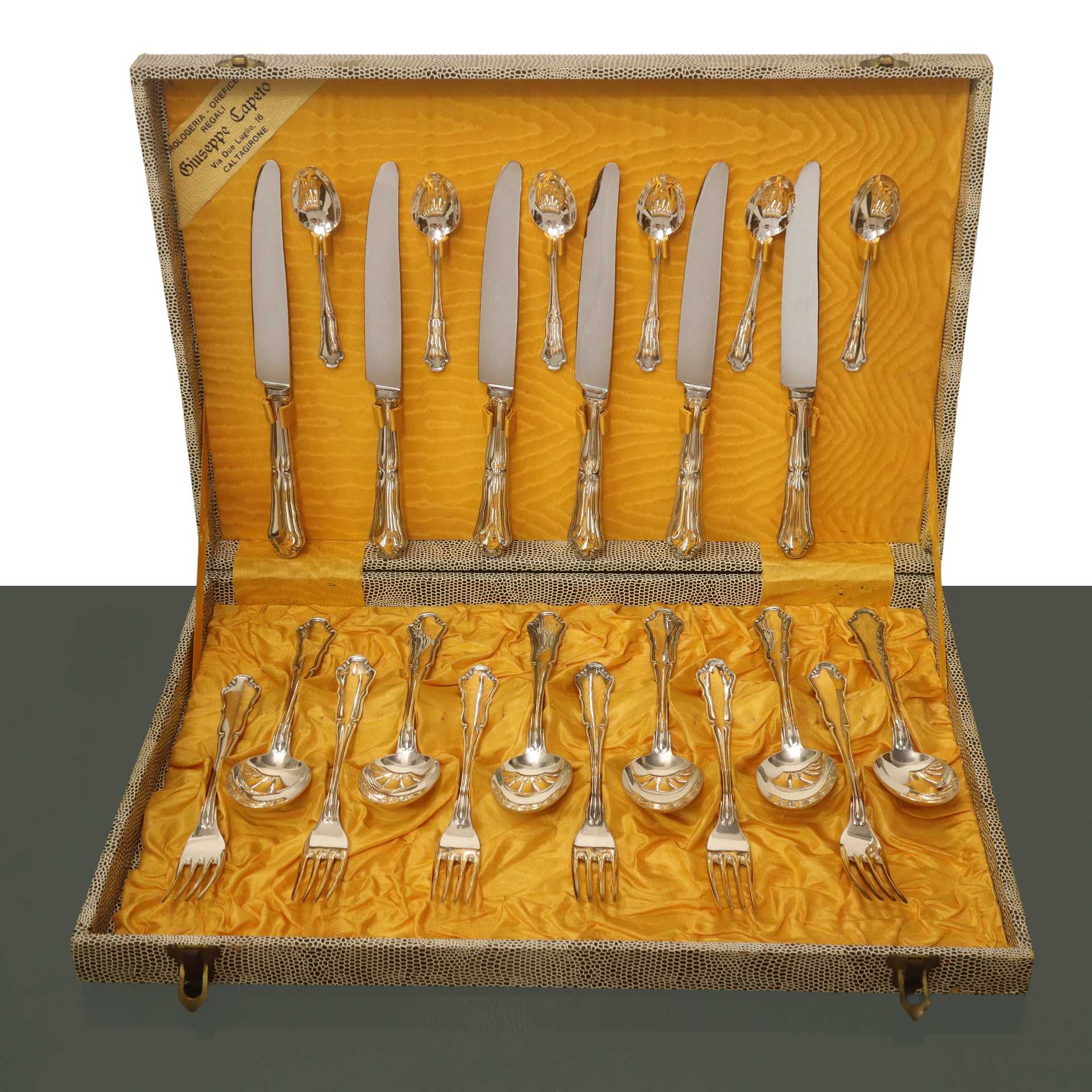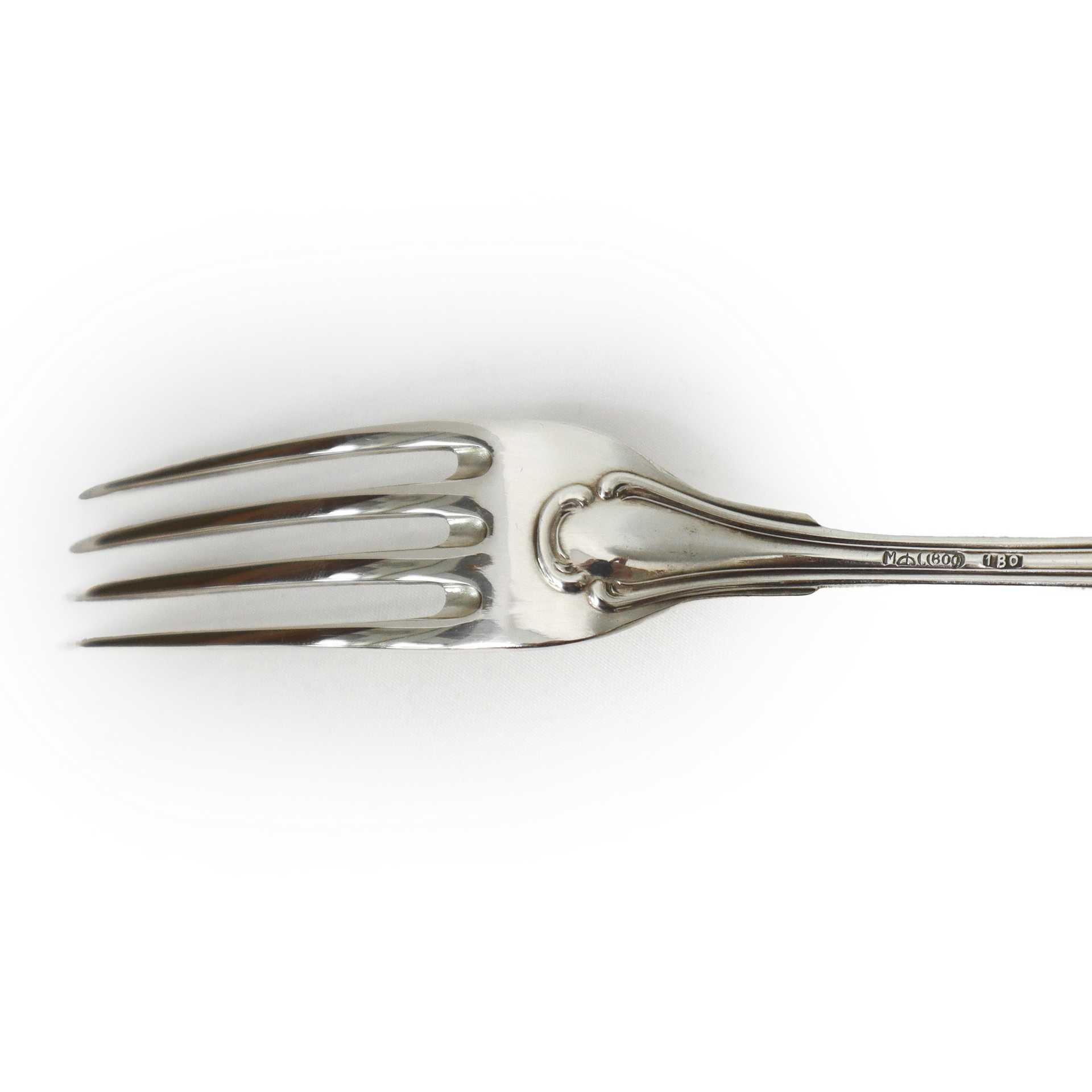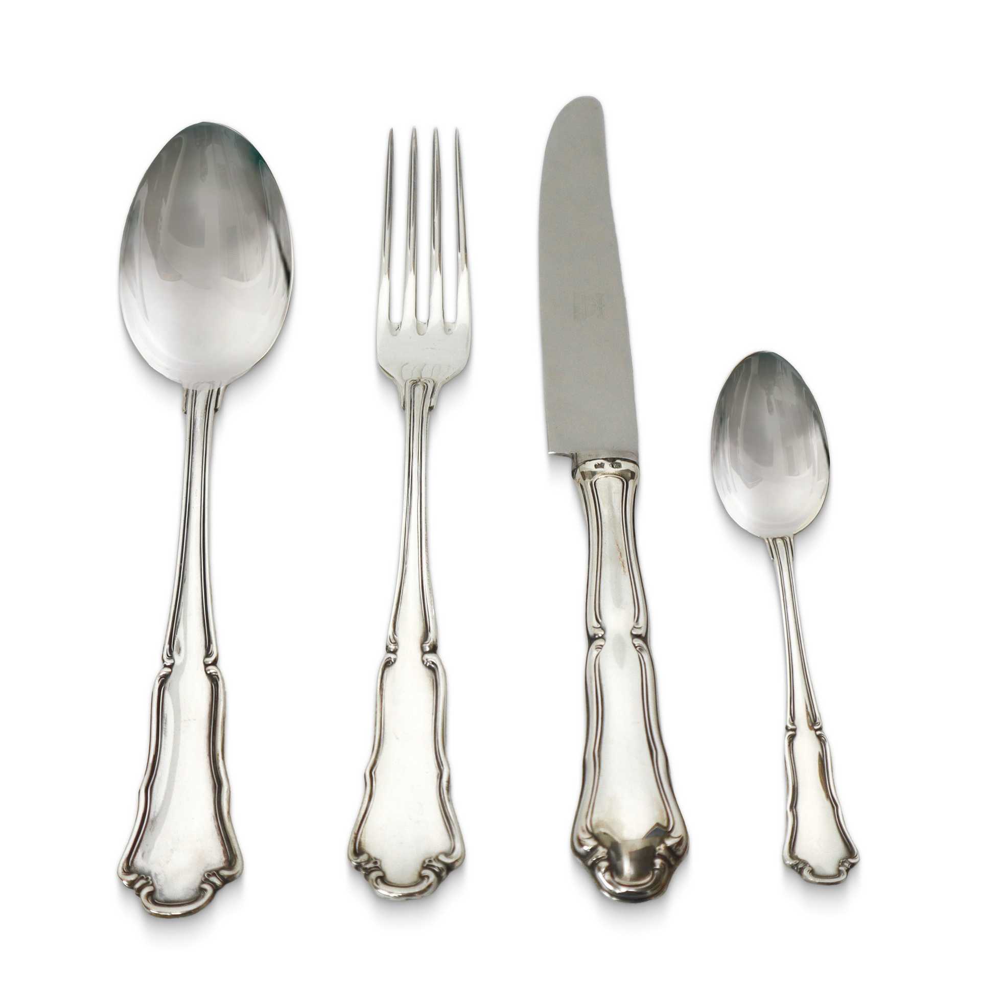 Servizio di posate in argento 800 per 6 persone 790 gr totale. Composto da : 6 cucchiai (348 gr), 6 forchette ( 346 gr) , 6 coltelli, 6 cucchiaini ( 96 gr) Composto da : 6 cucchiai (348 gr), 6 forchette ( 346 gr) , 6 coltelli, 6 cucchiaini ( 96 gr)
