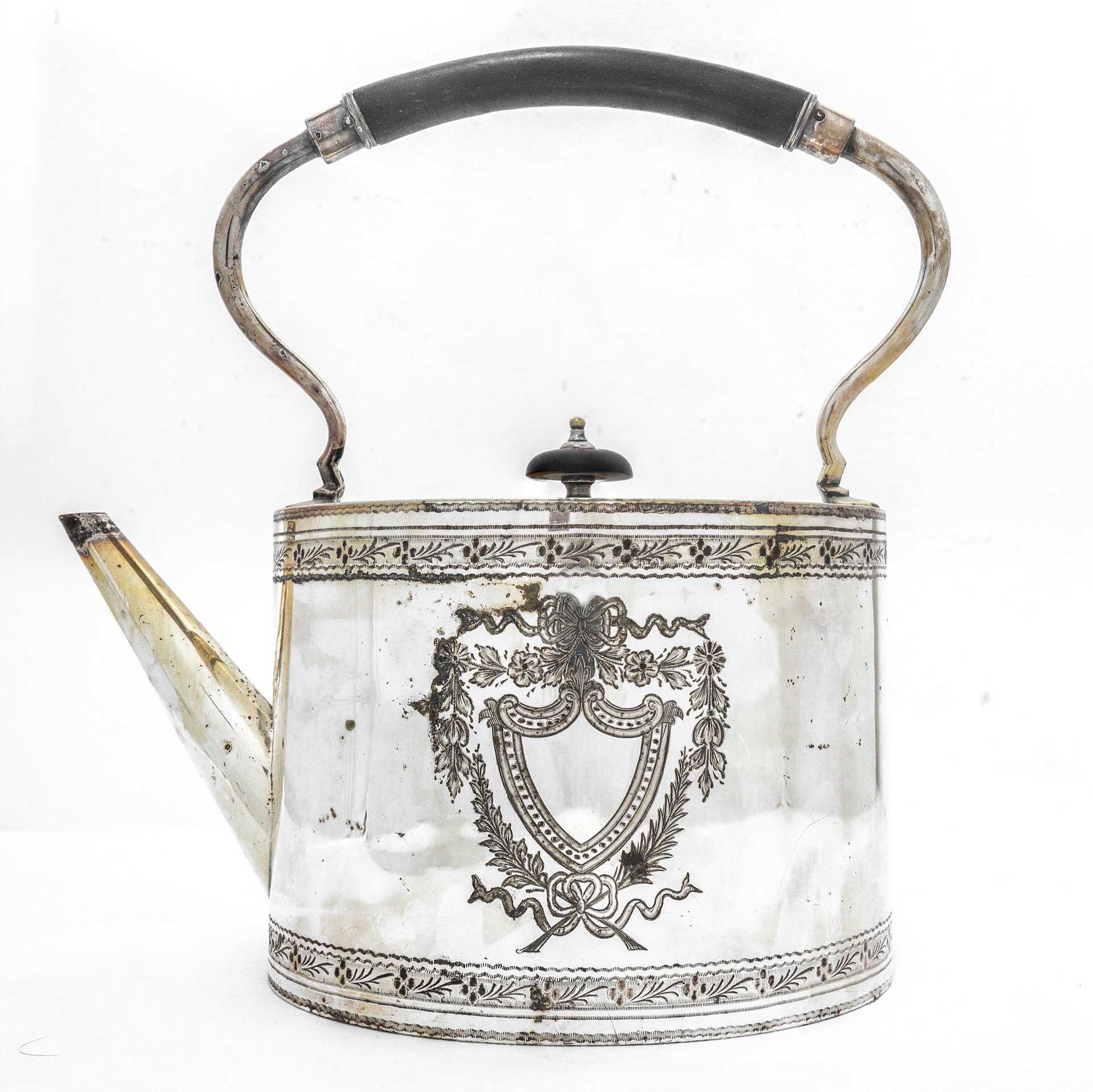 Teiera in sheffield con decori fronte e retro
