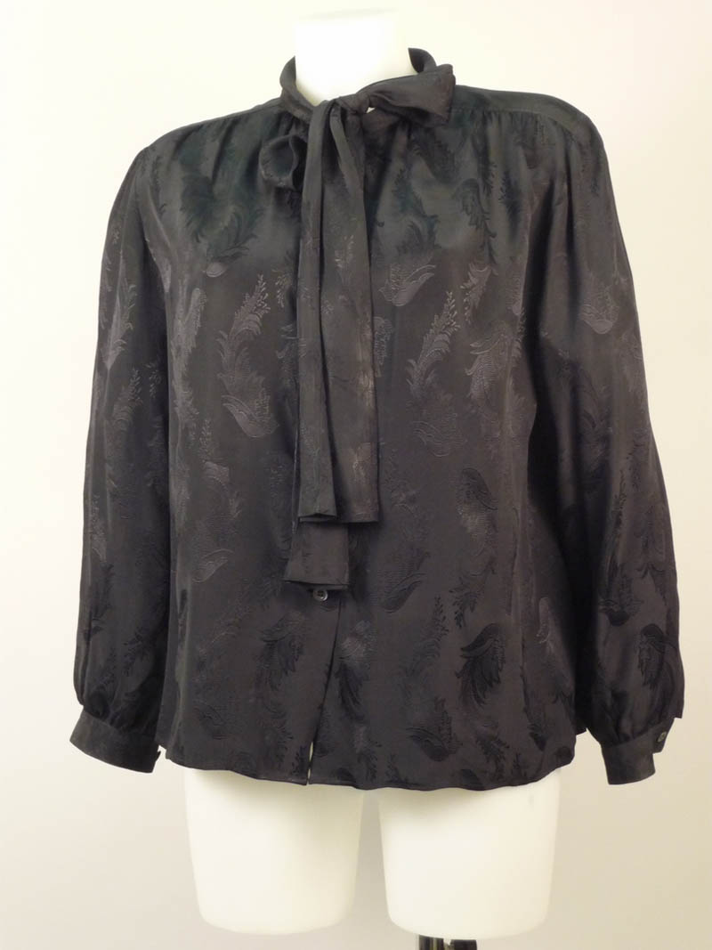 CAMICIA IN SETA NERA - BLACK SILK BLOUSE Gucci stampa con piume in tono, allacciatura con fiocco sul collo tg 44