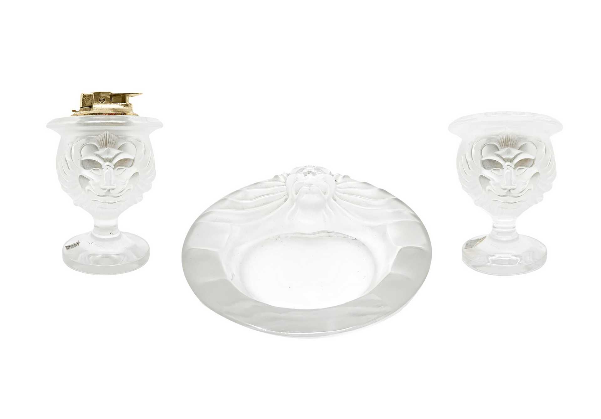 Lalique France (1888) - Set da fumatore in cristallo , France, 20th secolo Posacenere diametro cm 15; portasigarette h cm 9,5; accendino h cm 12 Composto da 3 pezzi: posacenere, portasigarette e accendino. Ottime condizioniComposto da 3 pezzi: posacenere, portasigarette e accendino. Ottime condizioni