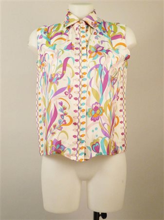 CAMICIA IN SETA FANTASIA - SILK PATTERN BLOUSE Paolo Davitti senza maniche a fantasia floreale nei toni del viola, rosa, verde e arancio, bottoni rivestiti, tg S circa