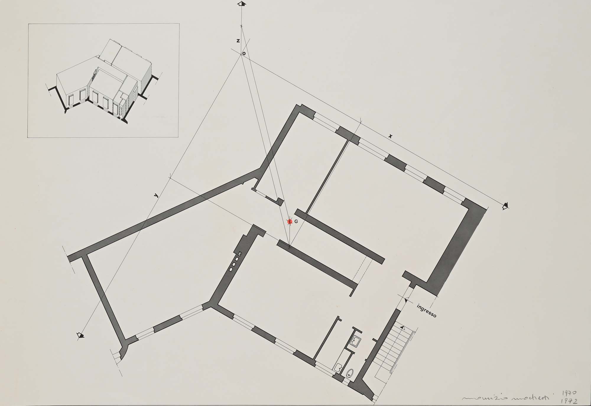 Maurizio Mochetti Senza titolo 1970 - 1972 Pianta architettonica stampata e inchiostro su carta cm 43x61 Firma e data "Maurizio Mochetti 1970 1972"