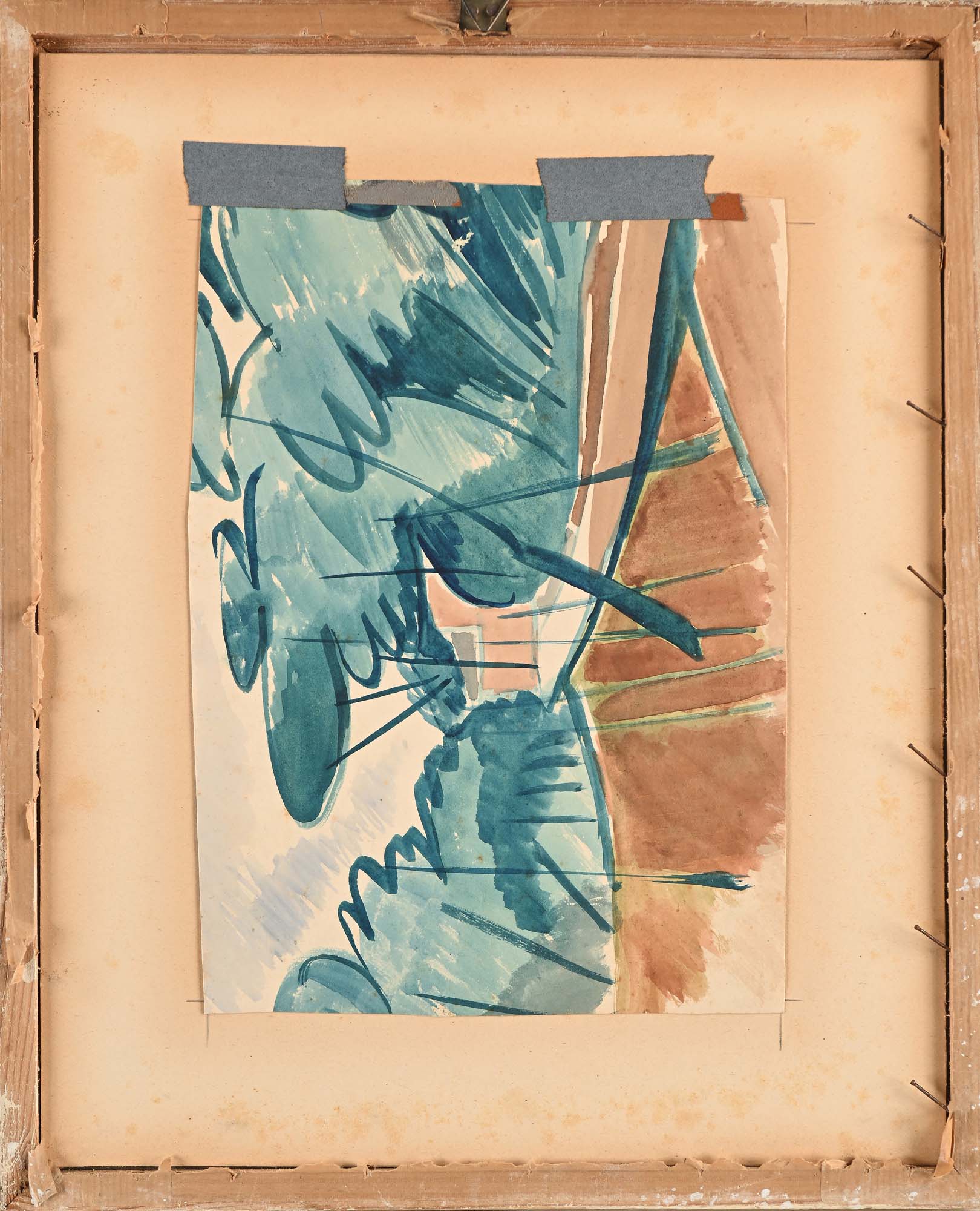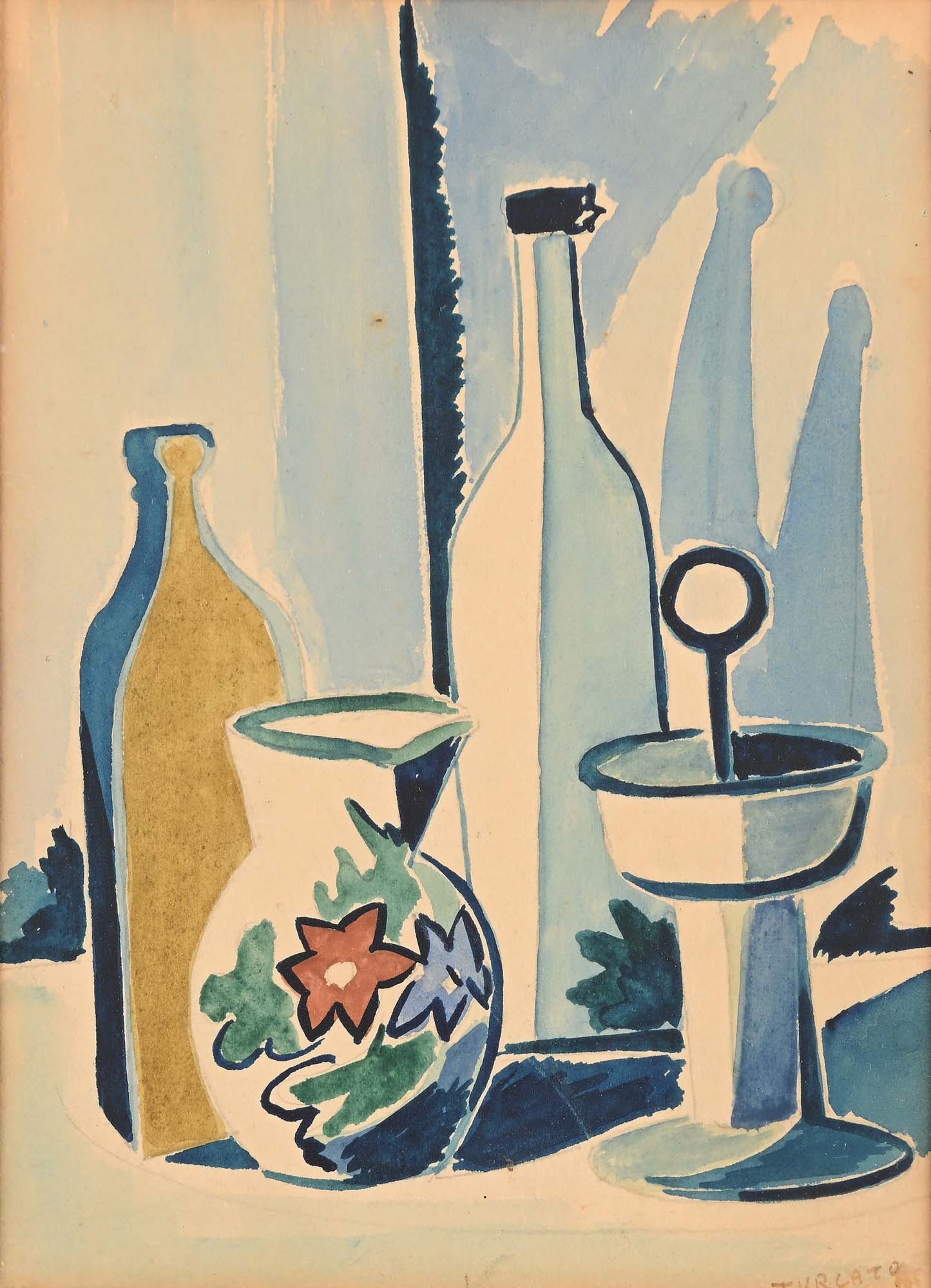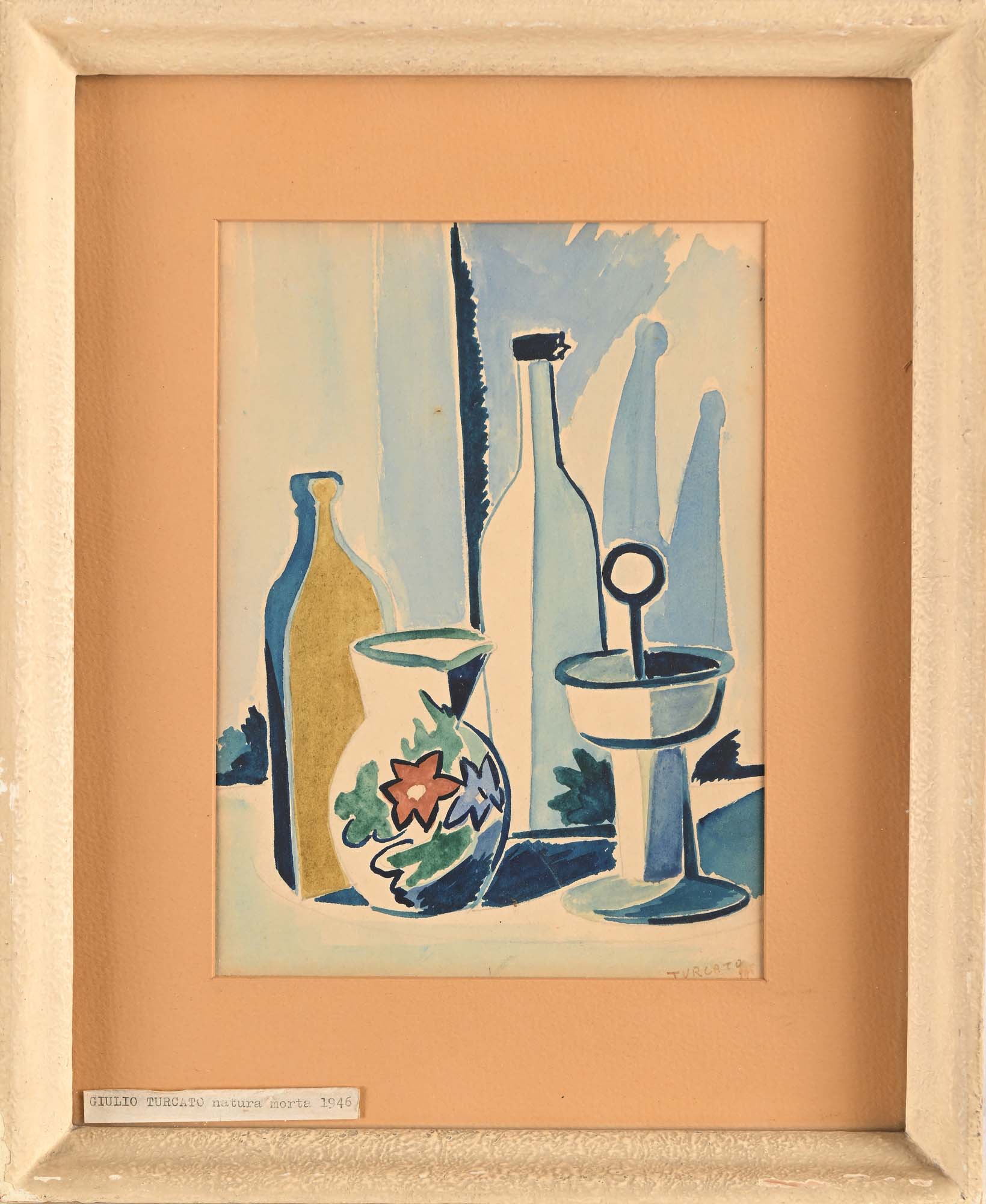 Giulio Turcato Natura Morta 1946 Matita e acquarello su carta cm 25,5x18,5 - in cornice cm 37x30 Firma e data in basso a destra "Turcato 946". Al verso reca disegno a tempera raffigurante paesaggio