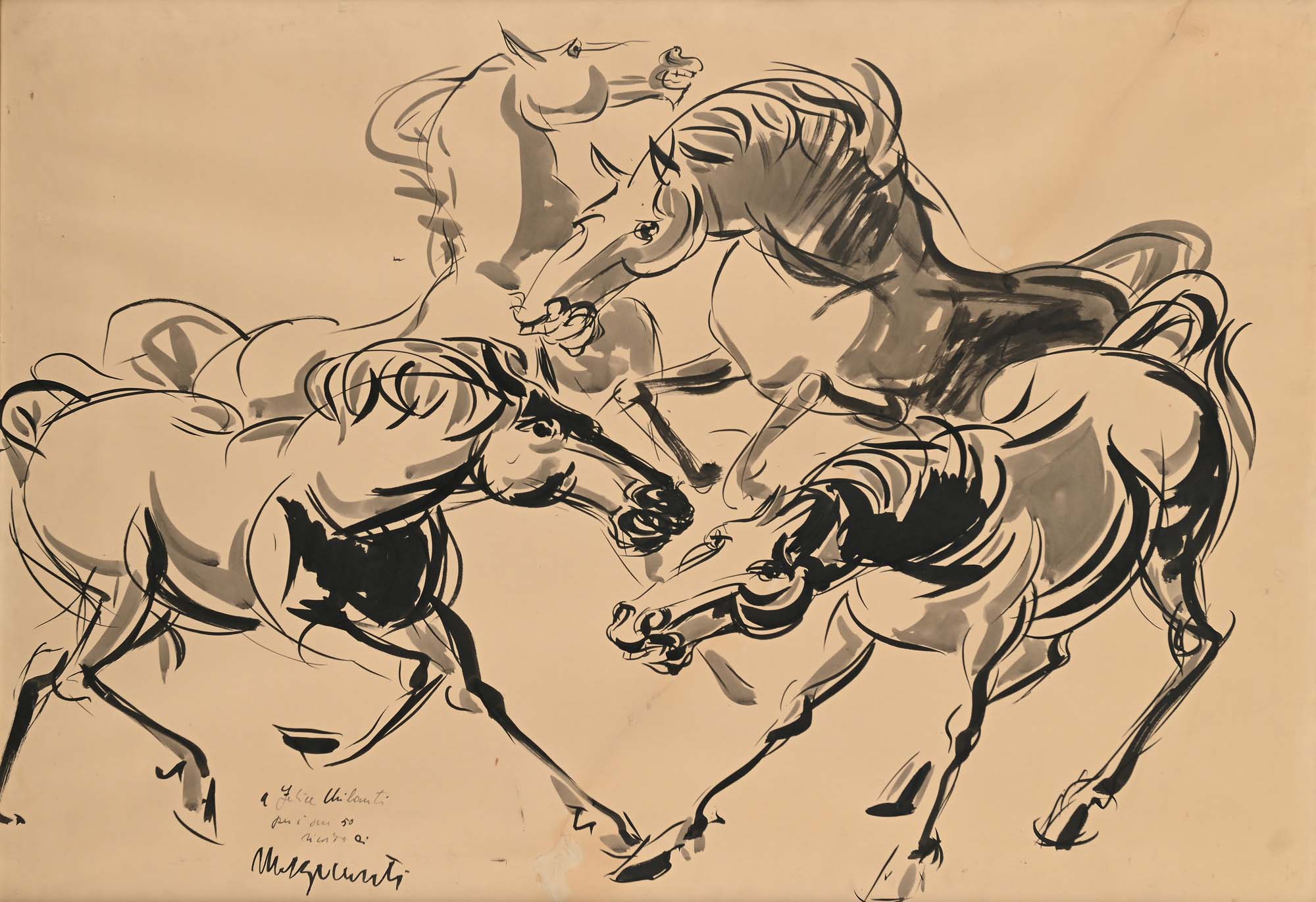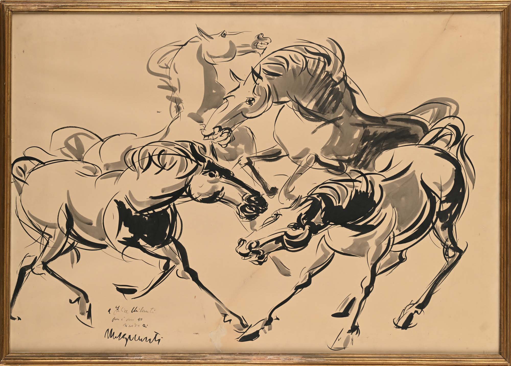 Renato Marino Mazzacurati Cavalli Inchiostro su carta cm 70x100 - in cornice cm 75x105 Firma e dedica in basso a sinistra " A Felice Chilanti per i suoi 50 ricordo di Mazzacurati" Coll. Felice Chilanti, Roma