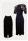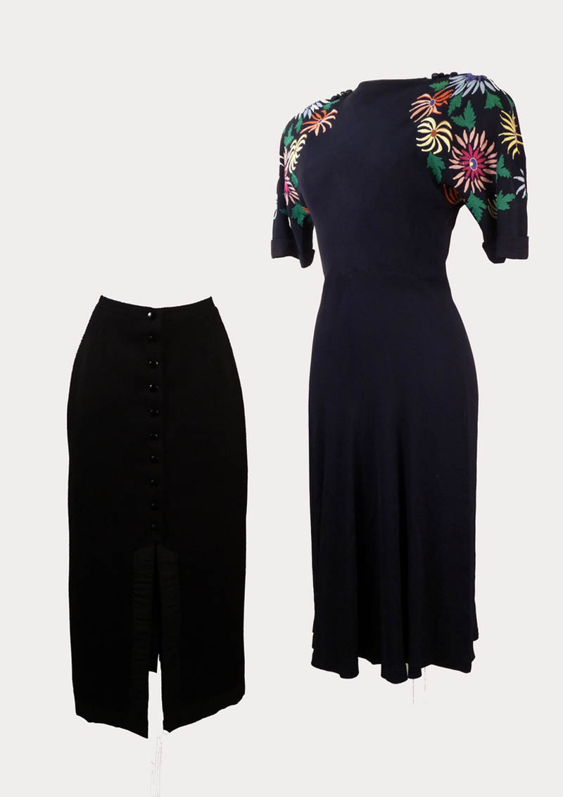 LOTTO - LOT un'abito in tessuto blu con ricami floreali sulle spalle nei toni del giallo, rosa e verde, manica corta ed una gonna in lana nera con abbottonatura sul davanti, modello lungo tg 42 circa (2)