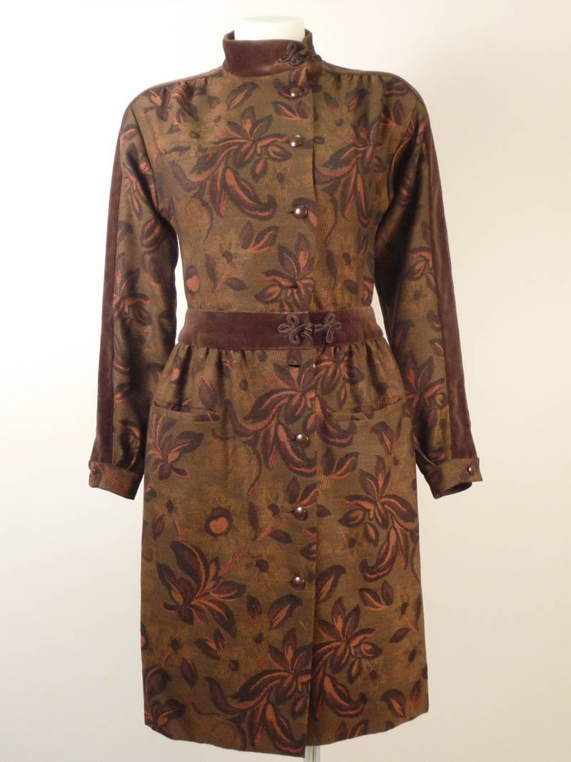 ABITO IN LANA MARRONE - BROWN WOOL DRESS Valentino Miss V fantasia floreale nei toni del rosso e marrone, inserti in velluto marrone, fascia in vita decorata con alamari, gonna con tasche e bottoni tg 40