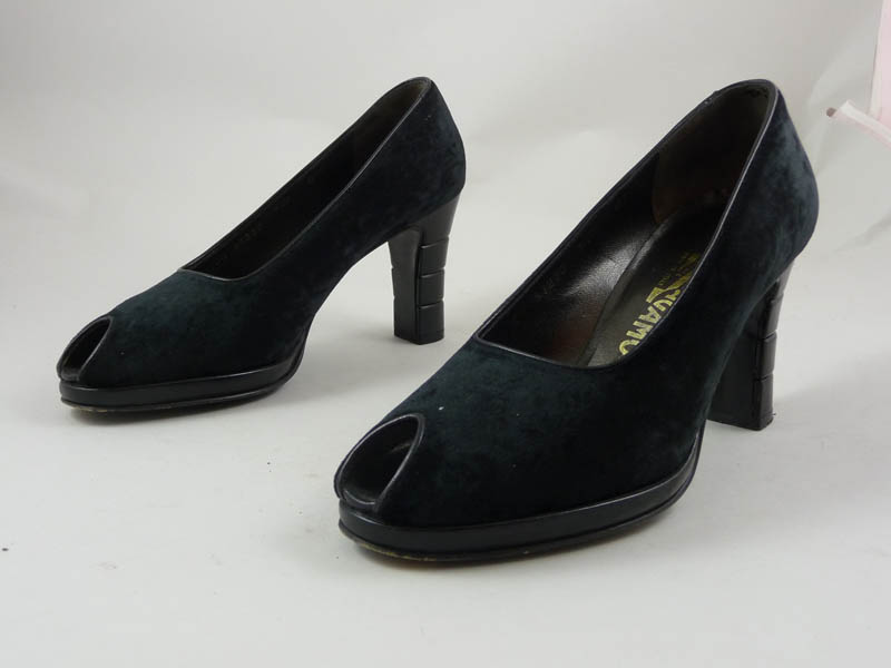 PAIO DI DECOLLETÈ IN VELLUTO NERO - BLACK VELVET DECOLLETÈ Salvatore Ferragamo open toe, tacco con scanalature, lievi difetti tg 7½