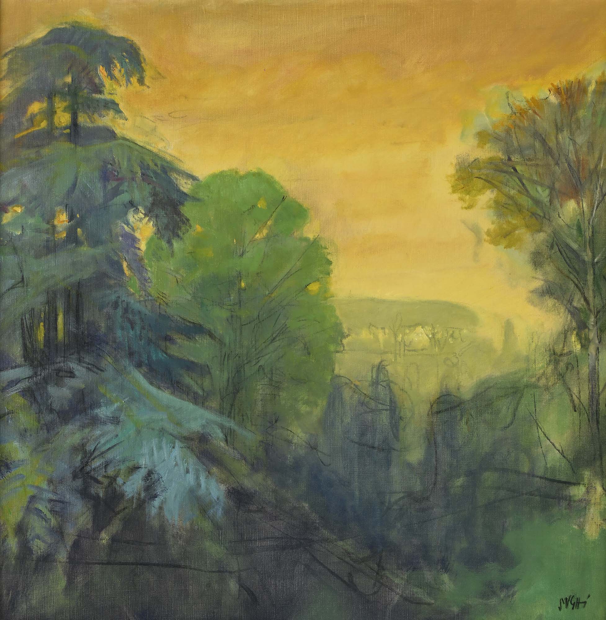 Alberto Sughi Veduta di città dal bosco 2001 Olio su tela cm 60x60 - in cornice cm 82x82 Firma in basso a destra "Sughi". Al verso reca dedica, firma e data