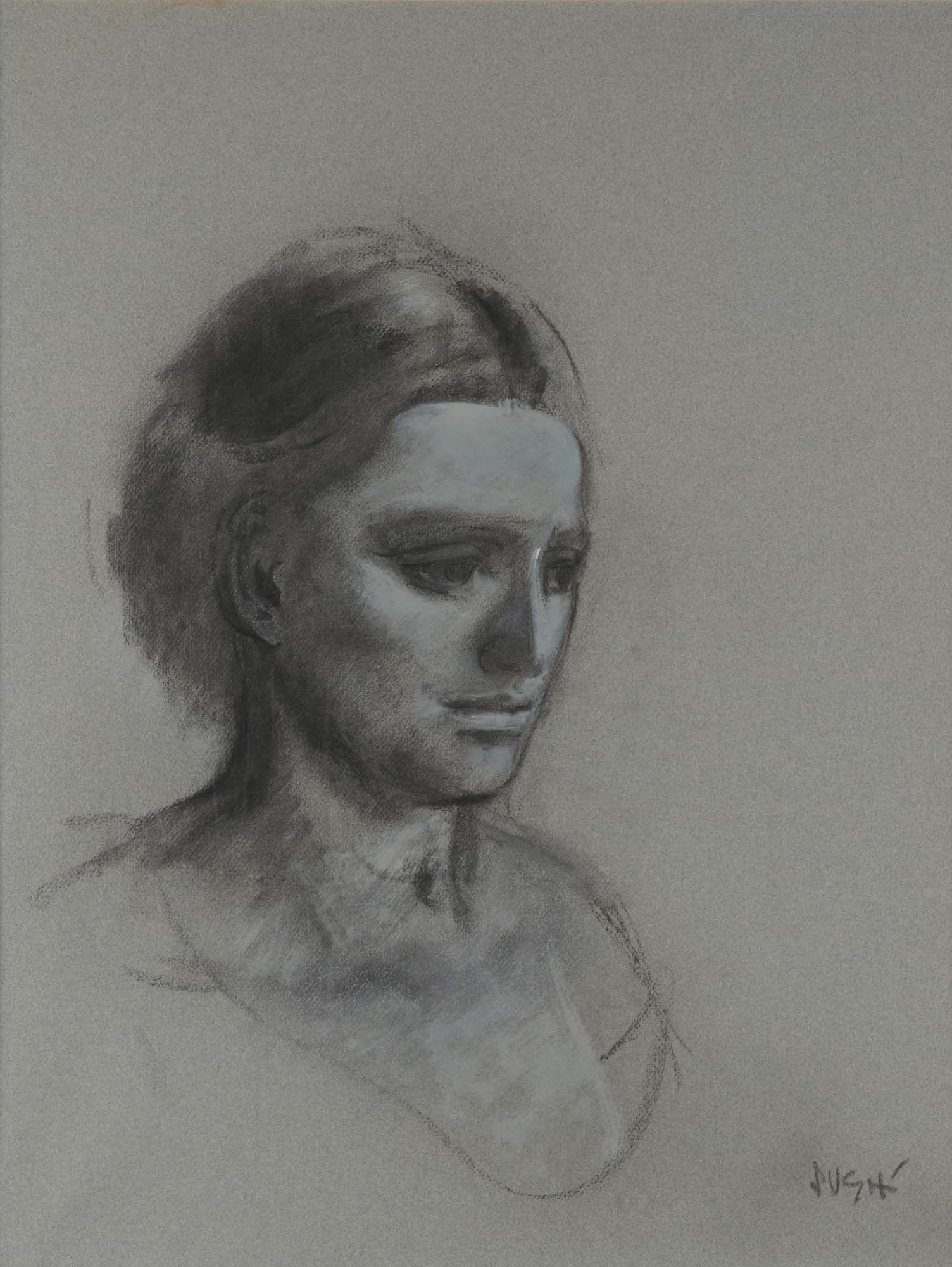 Alberto Sughi Ritratto Carboncino, pastelli e tempera su carta cm 65x50 - in cornice cm 84x69 Firma in basso a destra "Sughi". Al verso reca cartiglio della galleria Pinacoteca, Roma