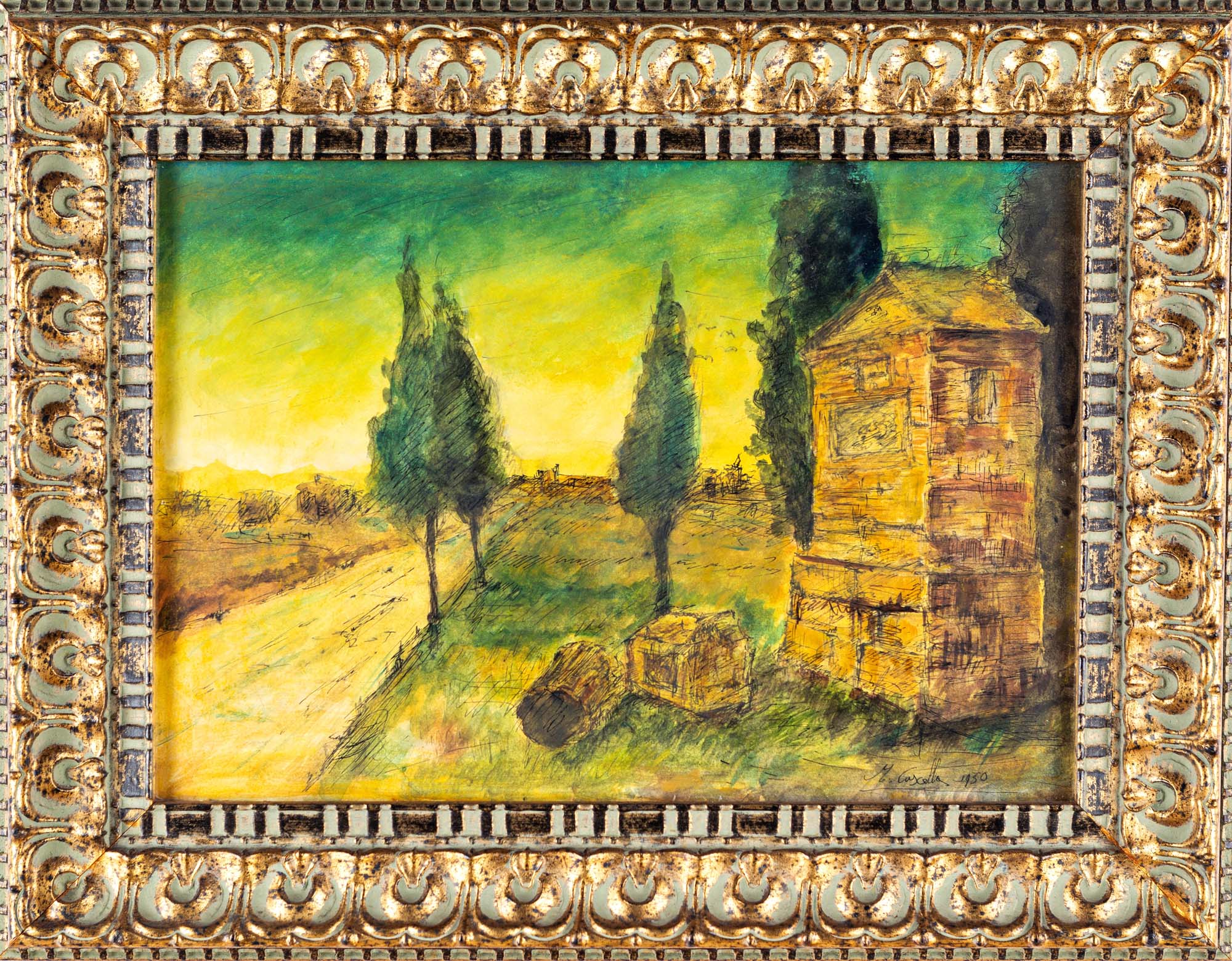 Michele Cascella Via Appia 1930 China, acquarello e tempera su carta cm 32x48 - in cornice cm 49x63,5 FIrma e data in basso a destra "M.Cascella 1930". Certificato di autenticità su fotografia scritto e firmato di pugno da Anna Cascella.