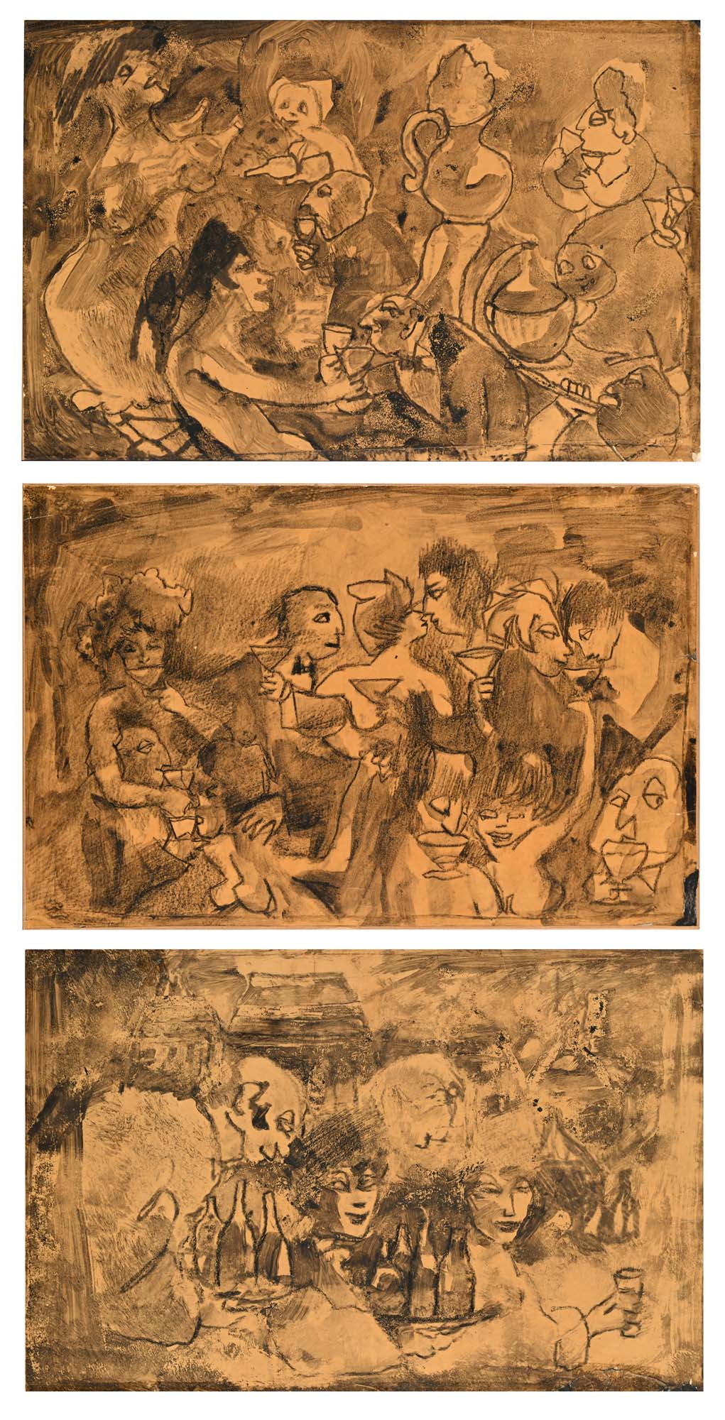 Mino Maccari Lotto di 3 opere raffiguranti Scene di festa e conviviali Inchiostro su carta applicata su tela ognuna misura cm 30x46