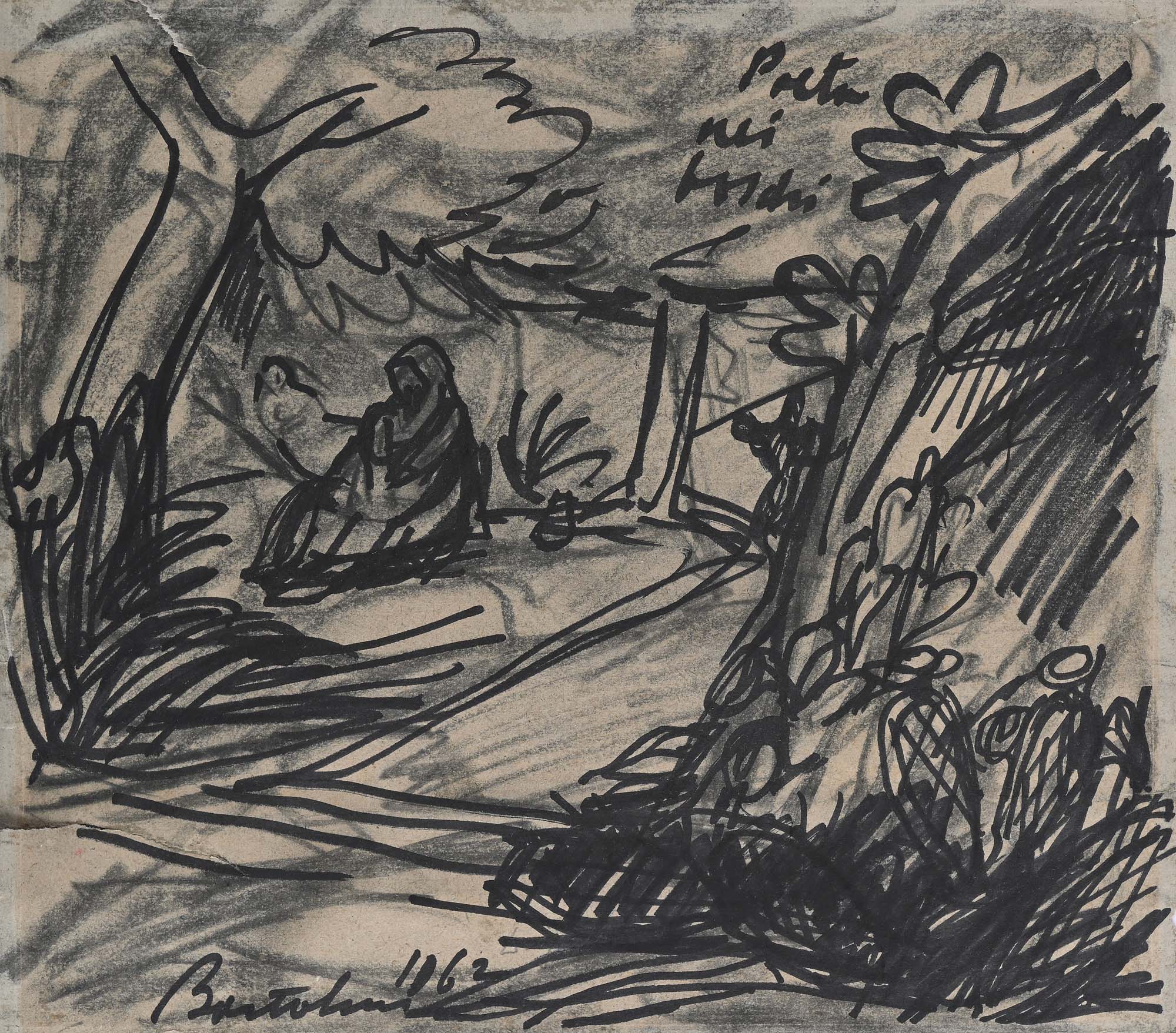 Luigi Bartolini Poeta nei boschi 1962 Carboncino e pennarelli su carta cm 26,5x30 Firma e data "Bartolini 1962"