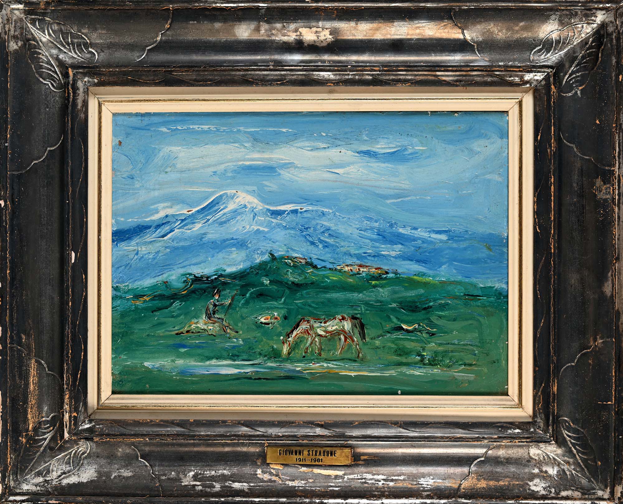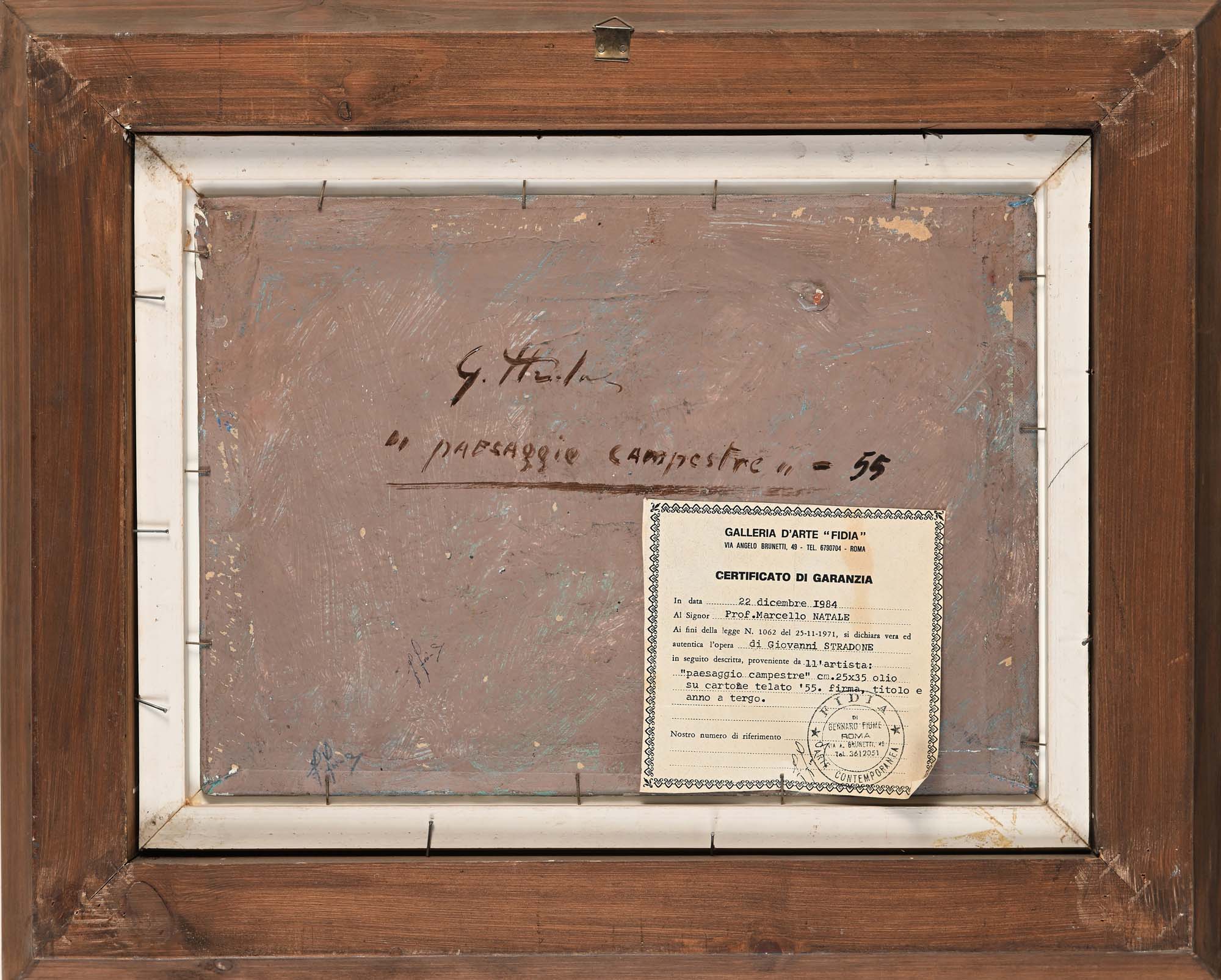 Giovanni Stradone Paesaggio campestre 1955 Olio su cartone telato cm 25x35 - in cornice cm 44x5 Firma, titolo e data al verso "G. Stradone, Paesaggio Campestre, 55". Etichetta della Galleria d'Arte Fidia, Roma