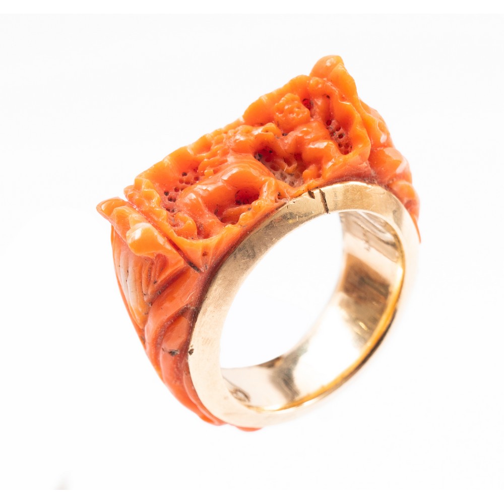 ANELLO in oro giallo 9 KT con corallo Sciacca lavorato (g. 8,20).