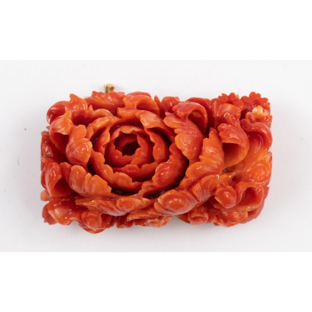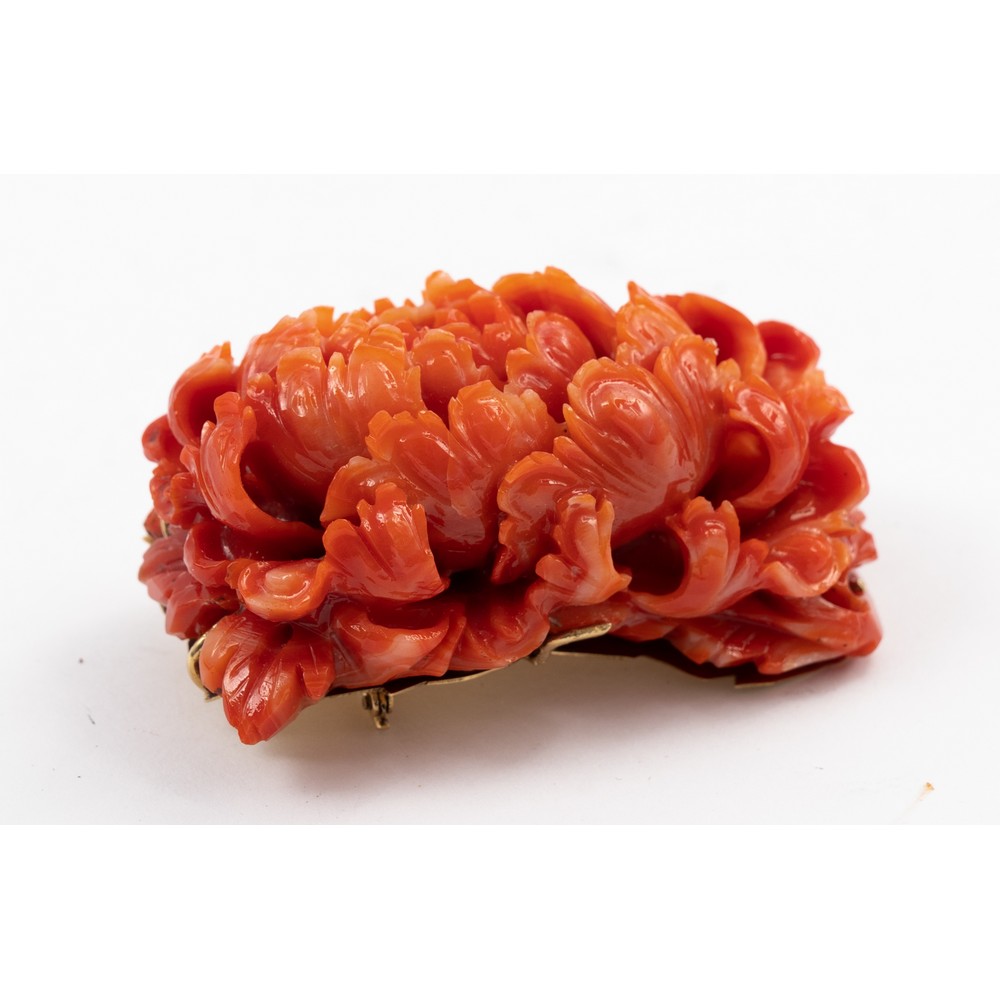 SPILLA in oro giallo 18 KT e corallo lavorato raffigurante "Fiori" (g. 67,96).