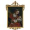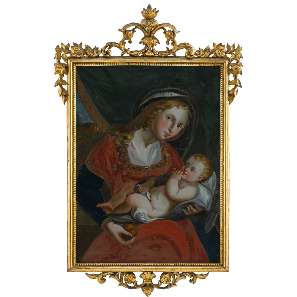 Olio su vetro raffigurante "Madonna con Bambino" entro cornice coeva in legno dorato ad argento e mistura.