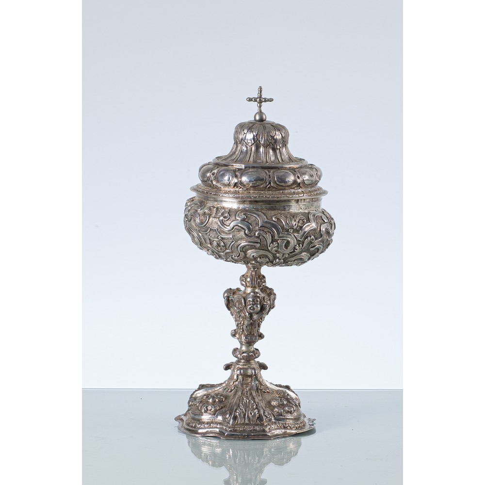 Importante pisside realizzata a Messina tra il dicembre 1733 ed il gennaio 1734 dal maestro Giuseppe d'Angelo, in argento e vermeil inciso e sbalzato con volute barocche che si articolano simmetriche fra teste di cherubini.