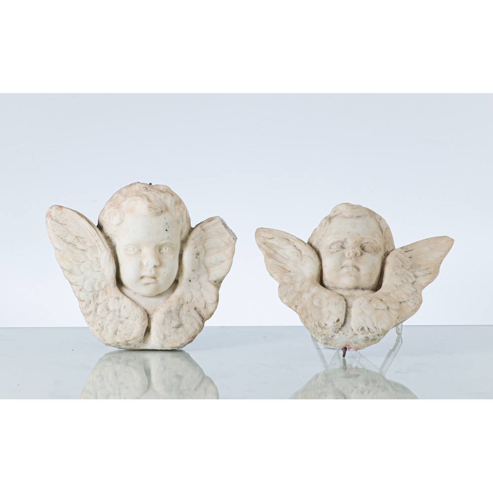 Coppia di teste di cherubini alati in marmo bianco di Carrara (difetti e usure del tempo).