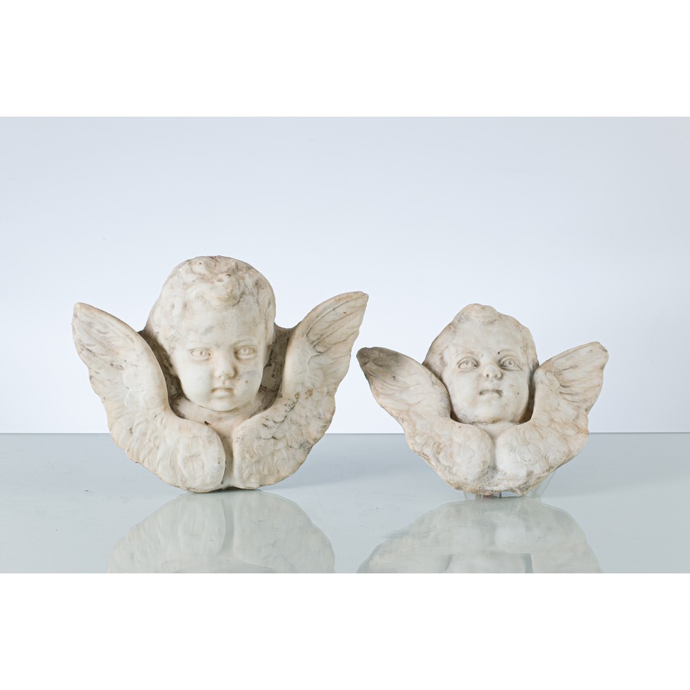 Coppia di teste di cherubini alati in marmo bianco di Carrara (difetti e usure del tempo).