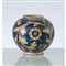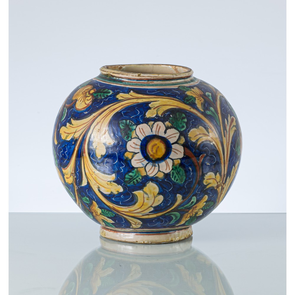 Boccia in maiolica policroma decorata e smaltata a motivi floreali nei toni del blu cobalto, verde ramina, giallo antimonio e marrone di manganese.