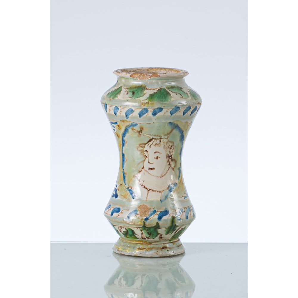 Albarello in ceramica smaltata e decorata con medaglione raffigurante "Mezzo busto di figura femminile" (usure e mancanze).