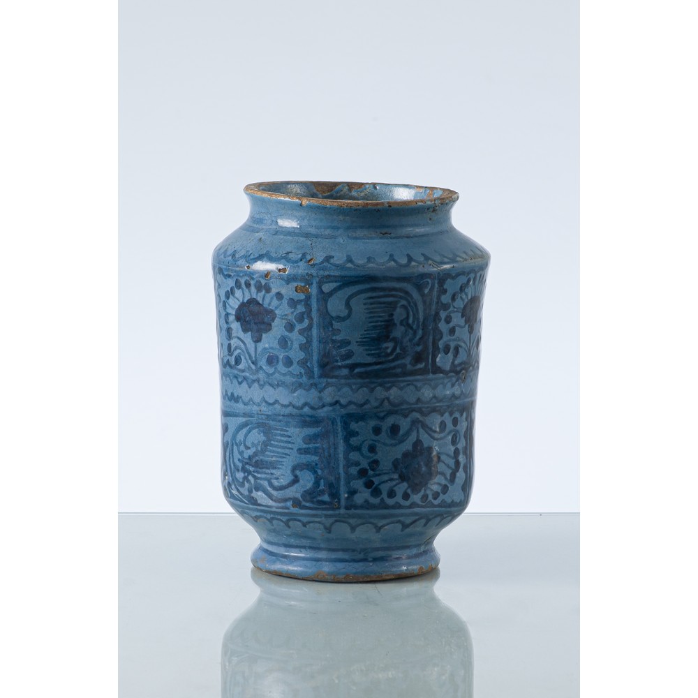 Cilindro in maiolica smaltata e decorata nei toni del blu.
