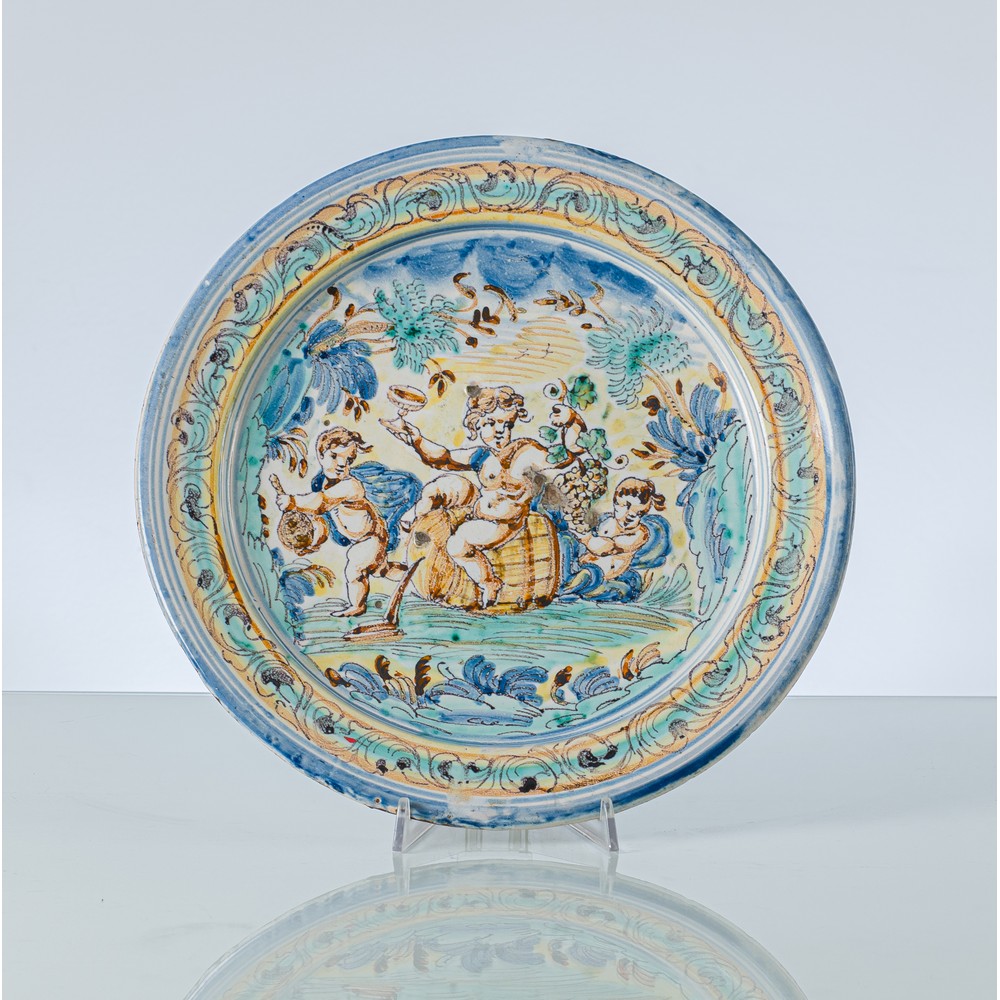 Piatto in maiolica policroma raffigurante "Scena di baccanale"