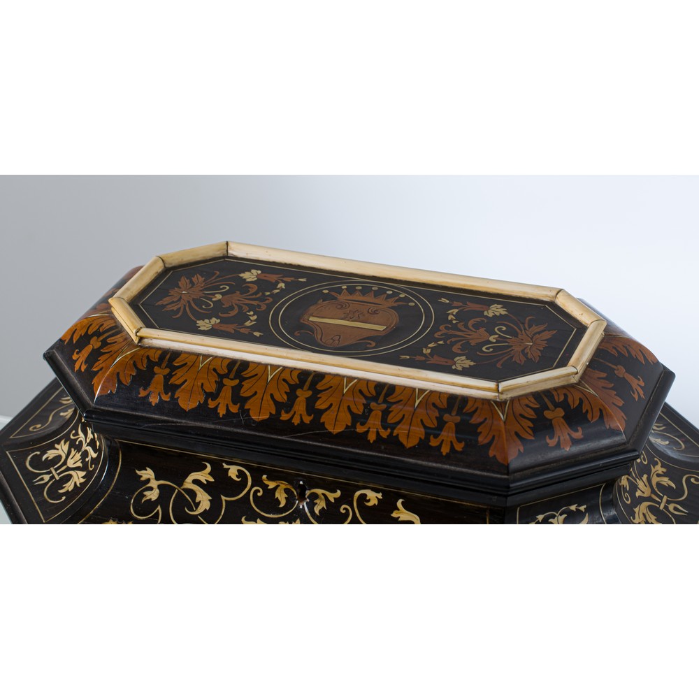 Importante scatola in legno lastronato con tarsie in osso, madreperla, bosso e legni da frutto con al centro blasone nobiliare