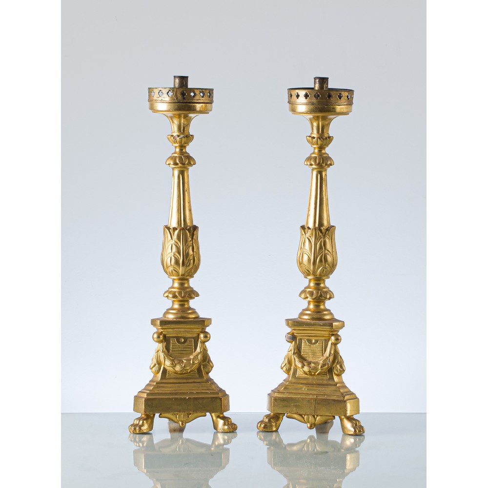 Coppia di torcieri monocera in stile Luigi XVI in legno intagliato e dorato.