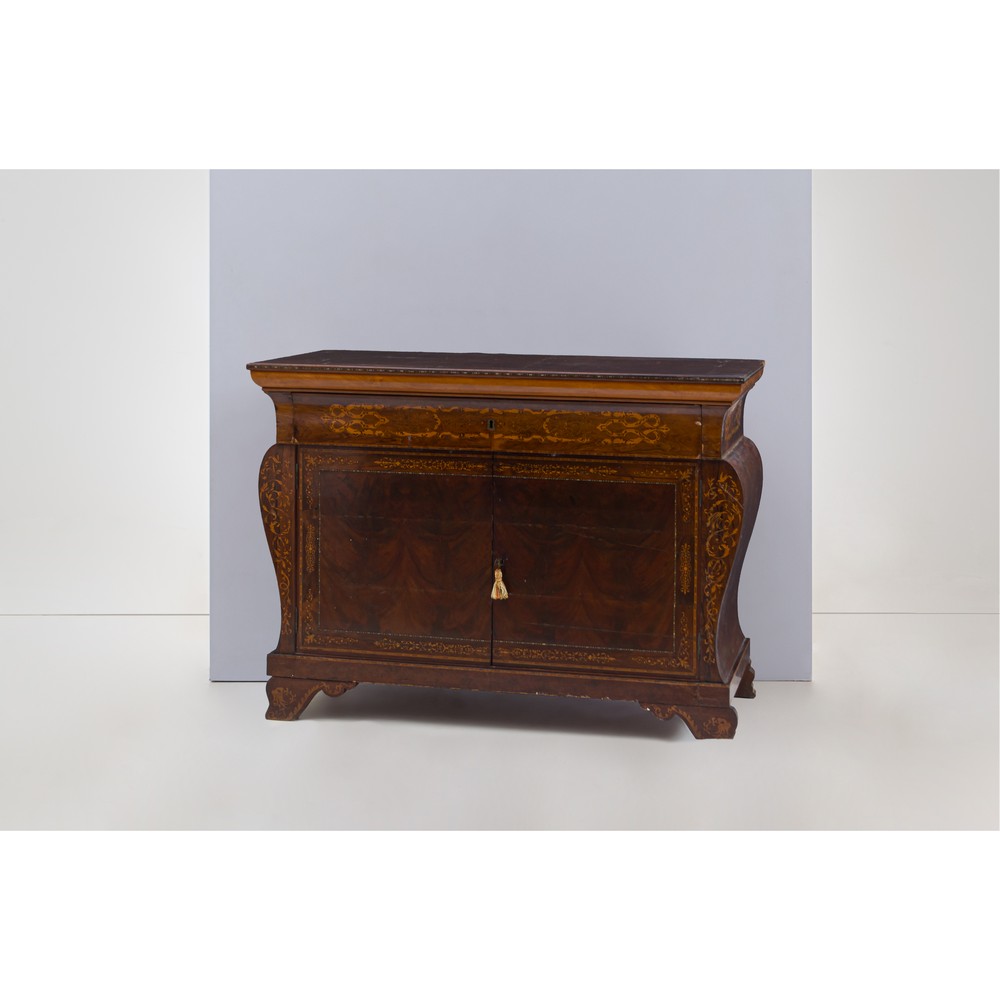 Credenza Isabellina con cassetto in legno lastronato in piuma di mogano con tarsie in bosso e legni da frutto.